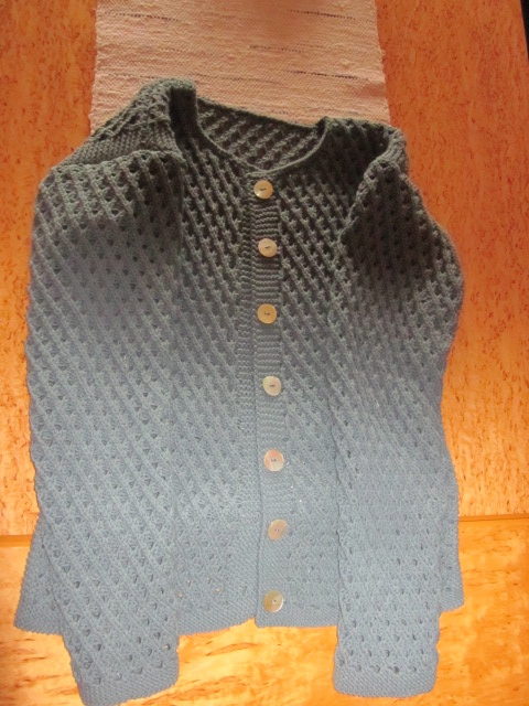 Den här tröjan till Tina började jag sticka på nån gång i januari. Tanken var att den skulle vara klar till hennes födelsedag i slutet av februari. Men jag hade faktiskt lite svårt att bli sams med mönsterstickningen. Jag fick aldrig nåt riktigt flyt. Eller också tittade jag för litet på tv för det är bara då jag stickar. Så jag gick emellan med Leias tröja som var gjord i ett nafs.