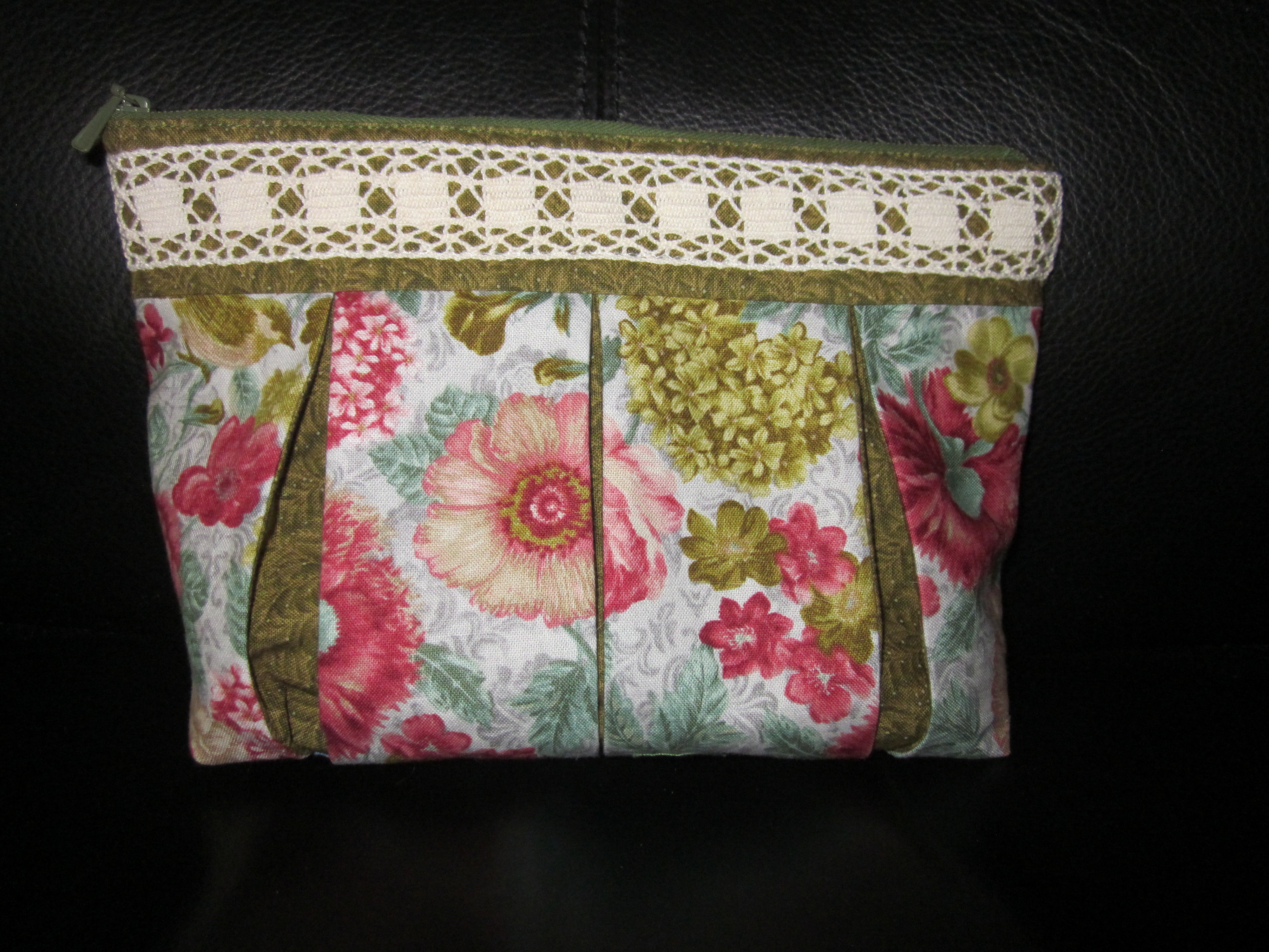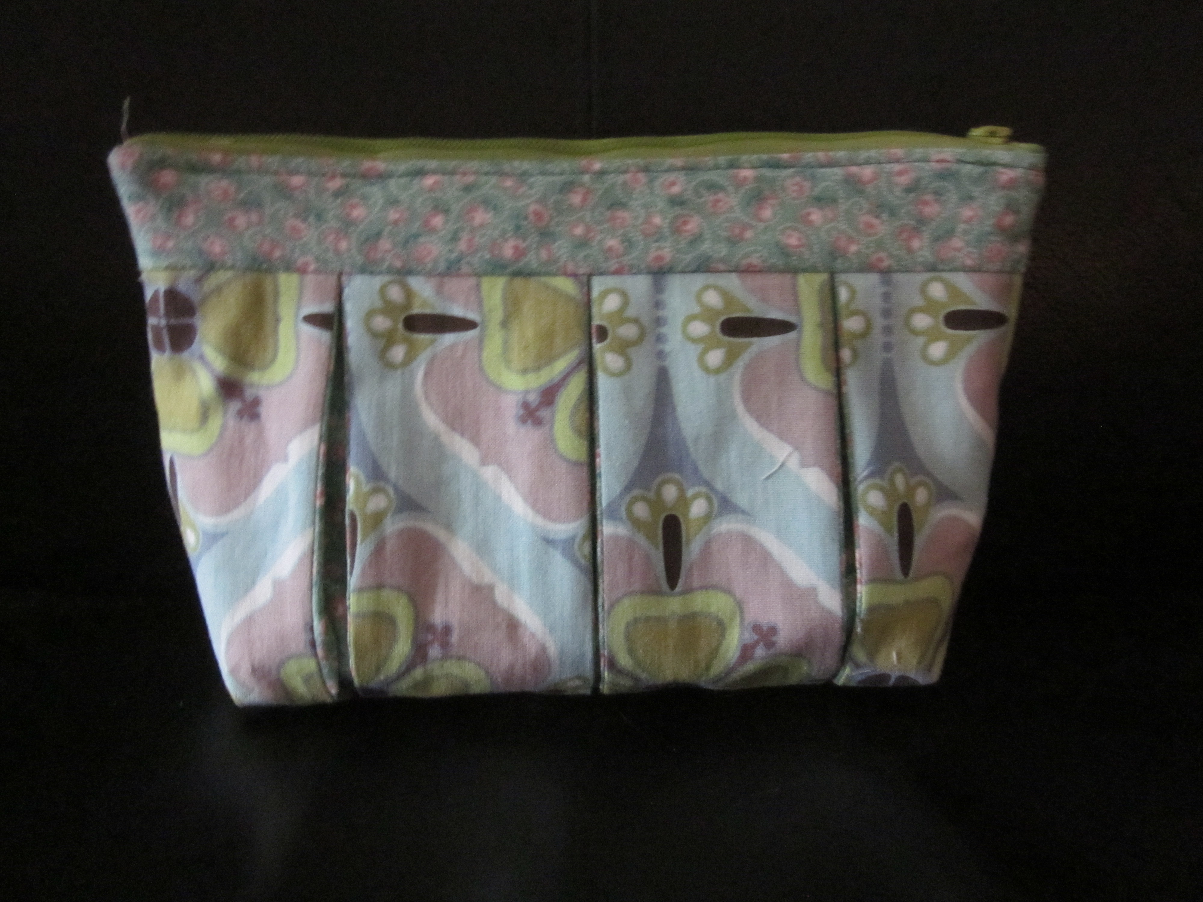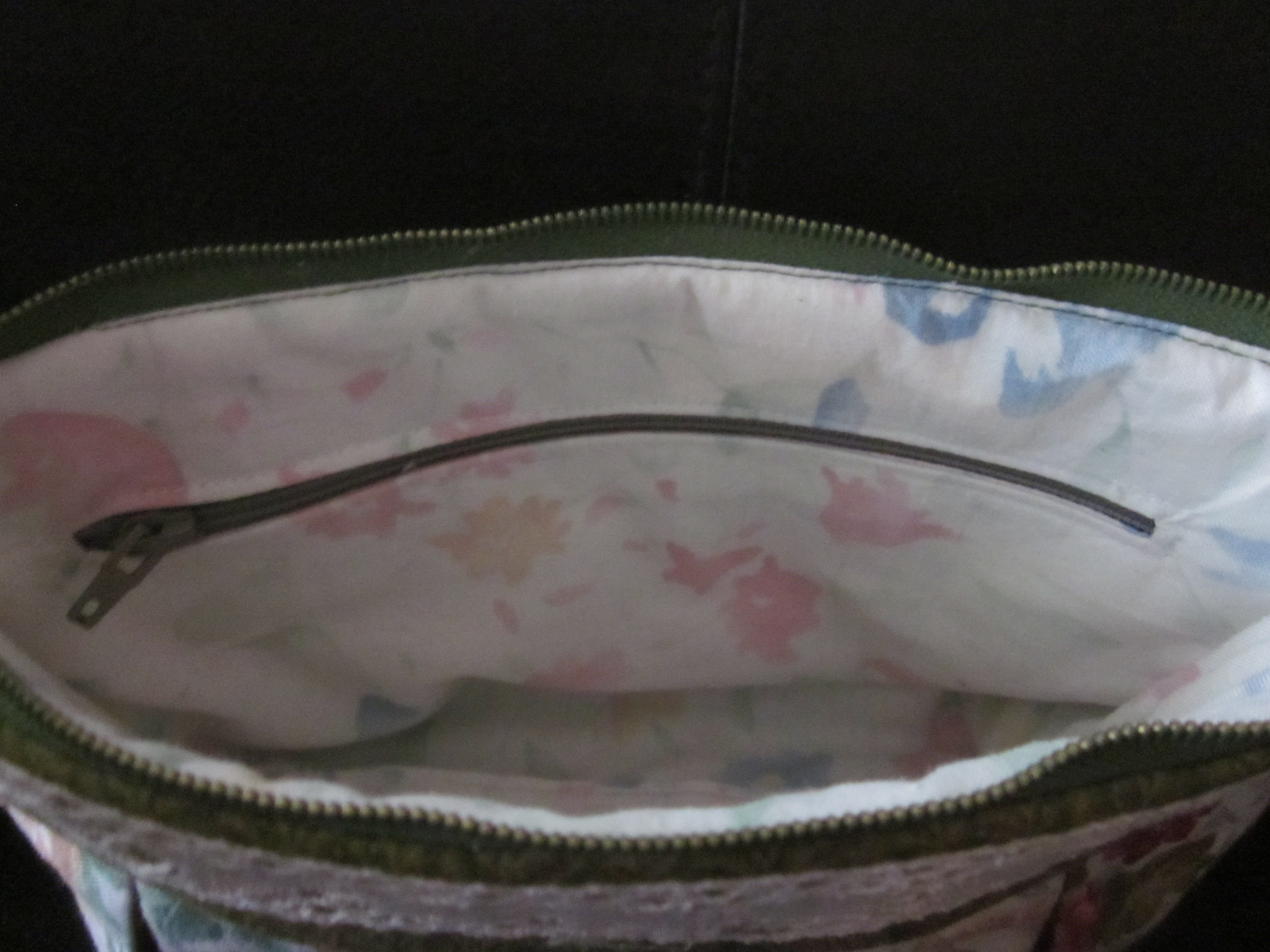 Se så fin den blev. Jag tycker den är helt underbar med det blommiga yttertyget och det gröna inne i bälgarna och på toppen. Även fodertyget är från Maja.