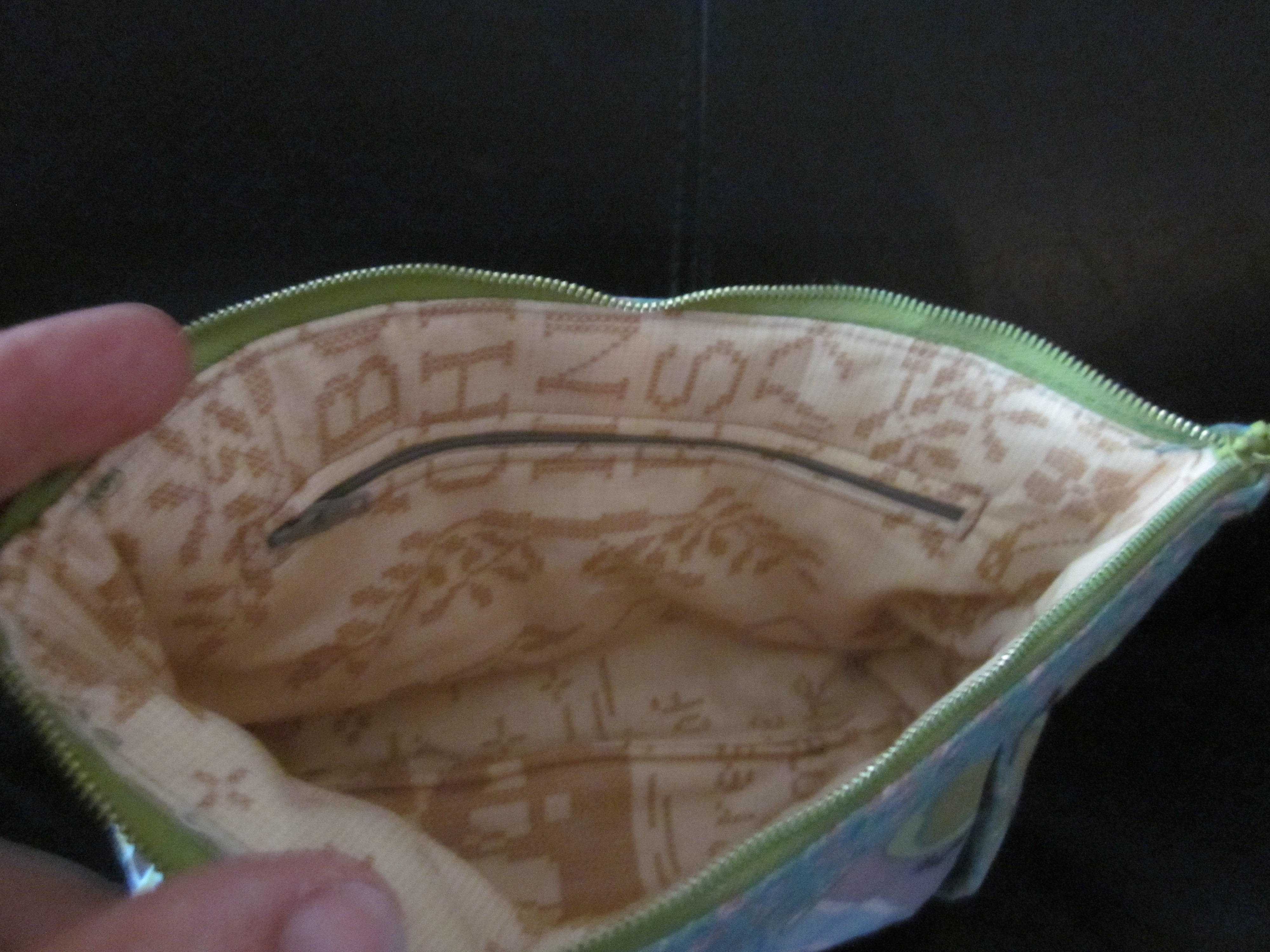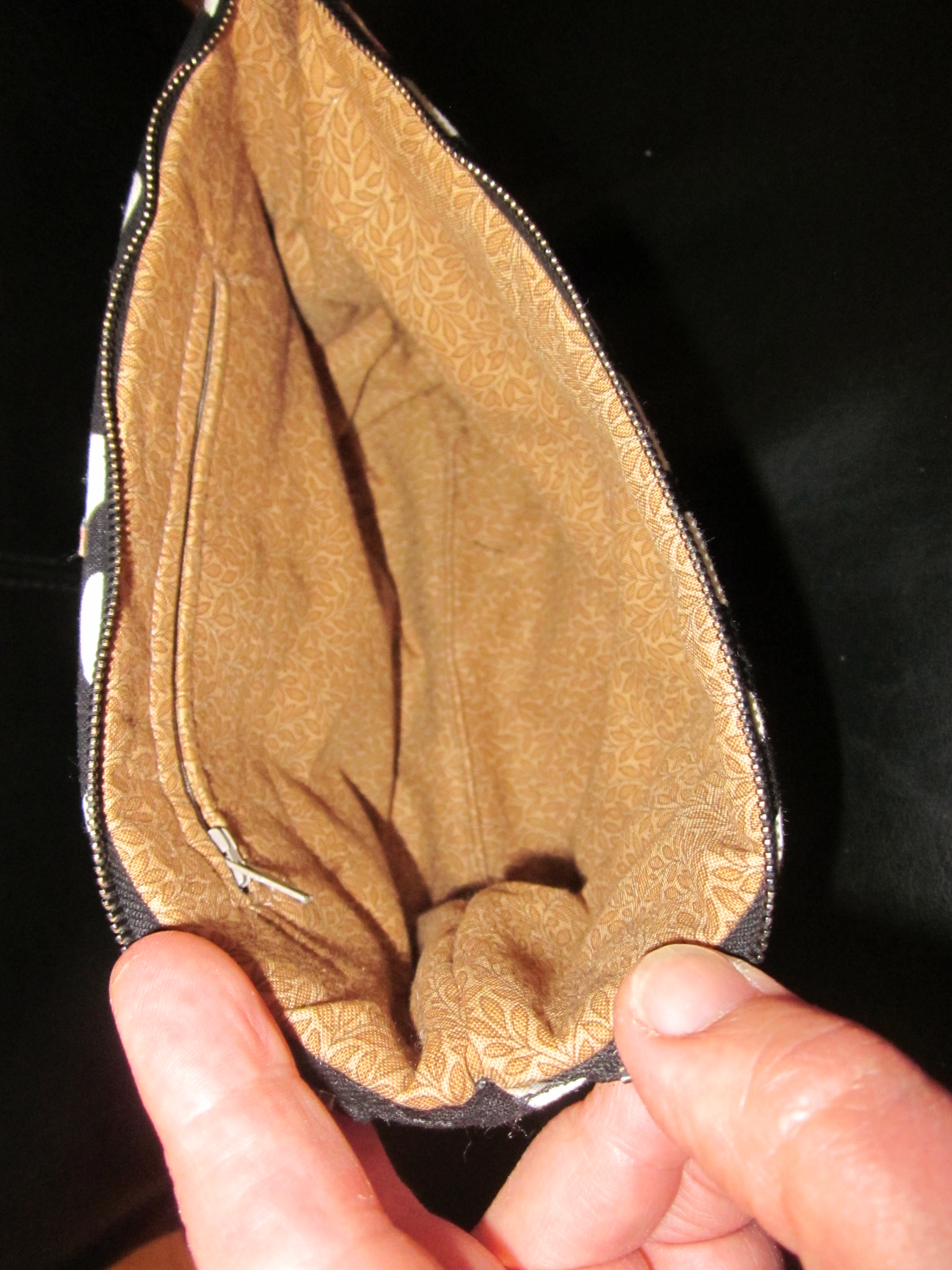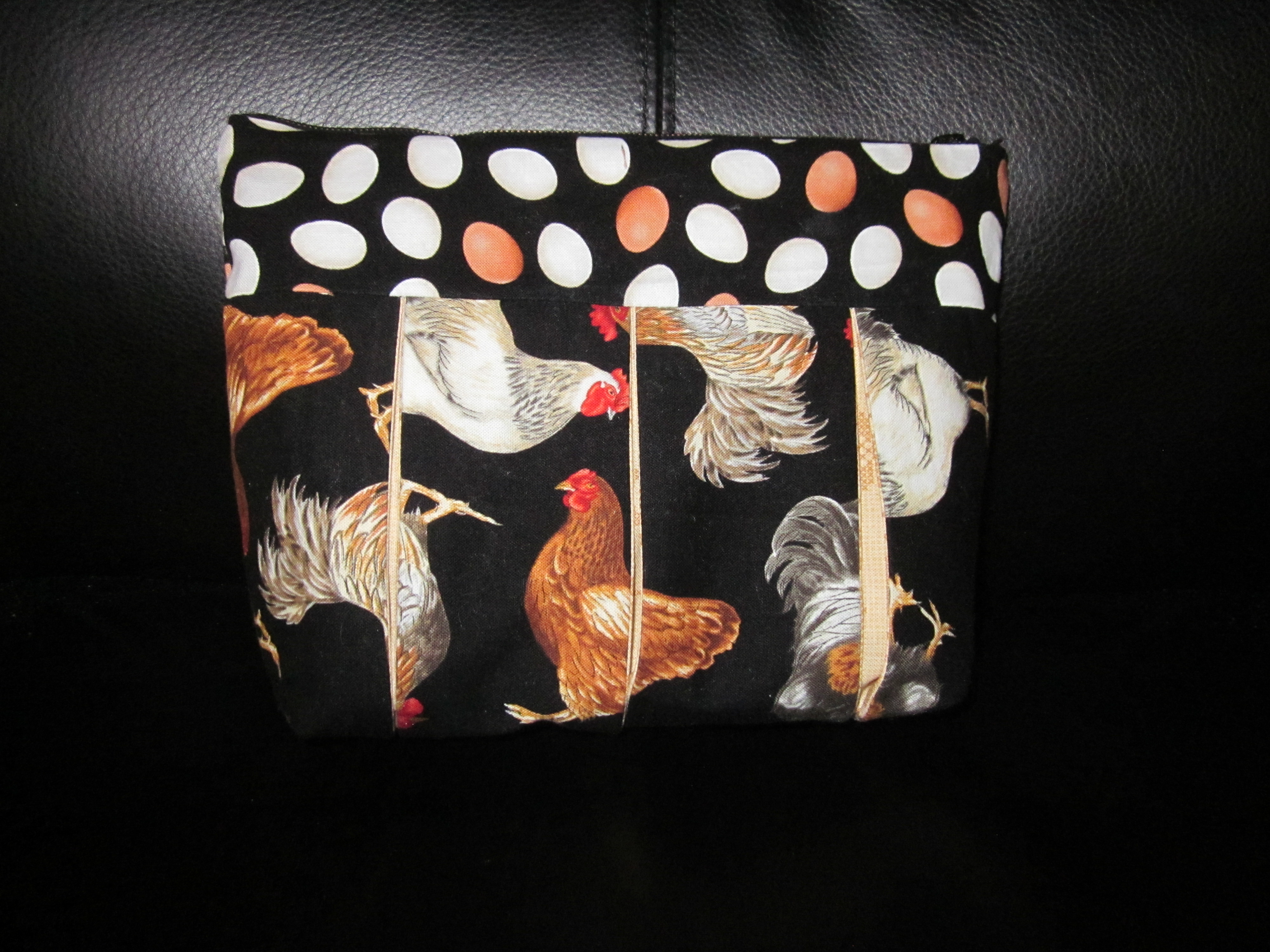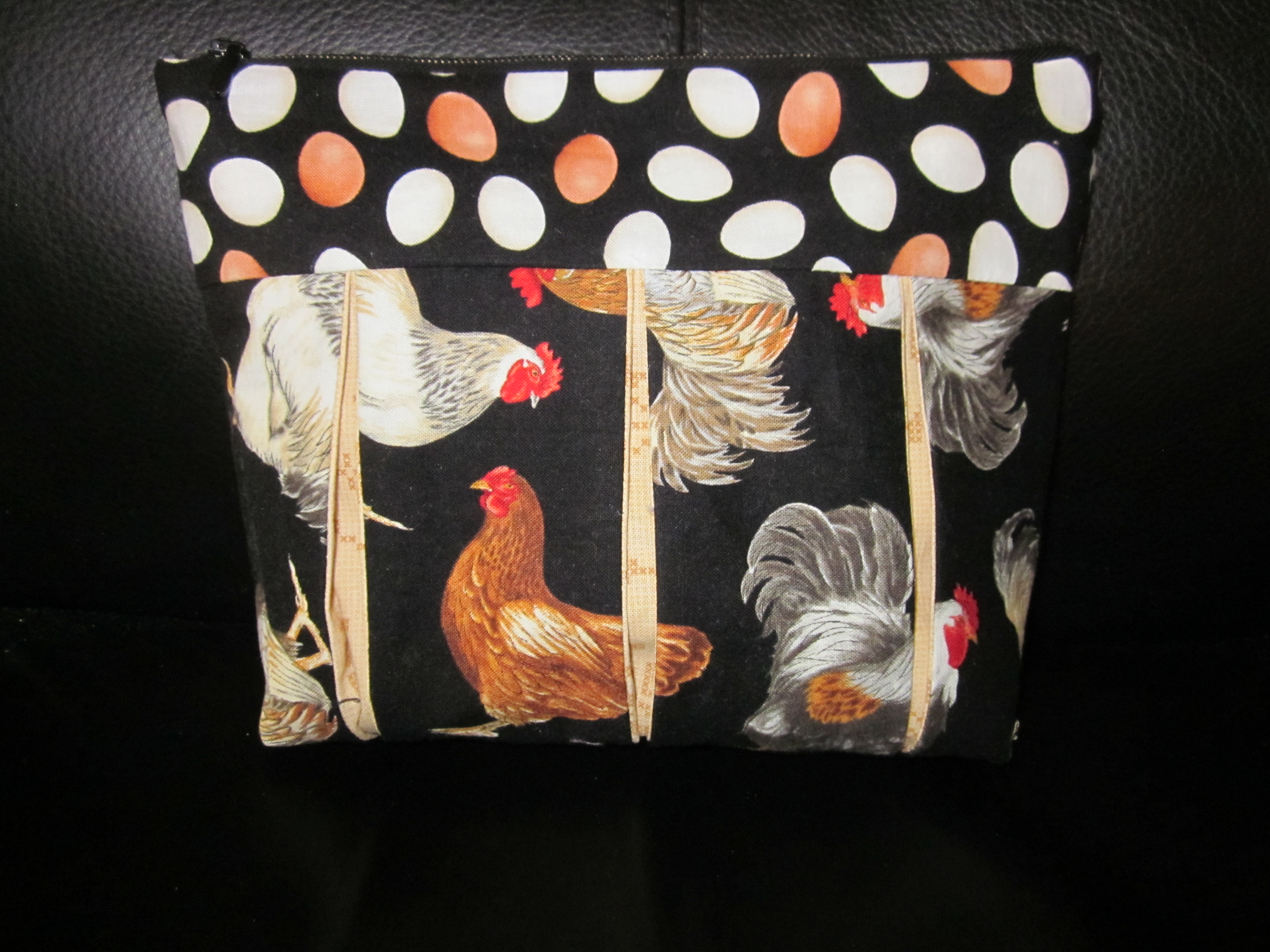 Så när jag ändå hade ångan uppe började jag med en till. Nu gick jag in på mina egna tyger. Hönor på utsidan och ägg på insidan var tanken. Men nu hade jag blivit lite för självsäker. Som vanligt ville jag sy en liten innerficka. Smarta jag sätter den på fel ledd…..