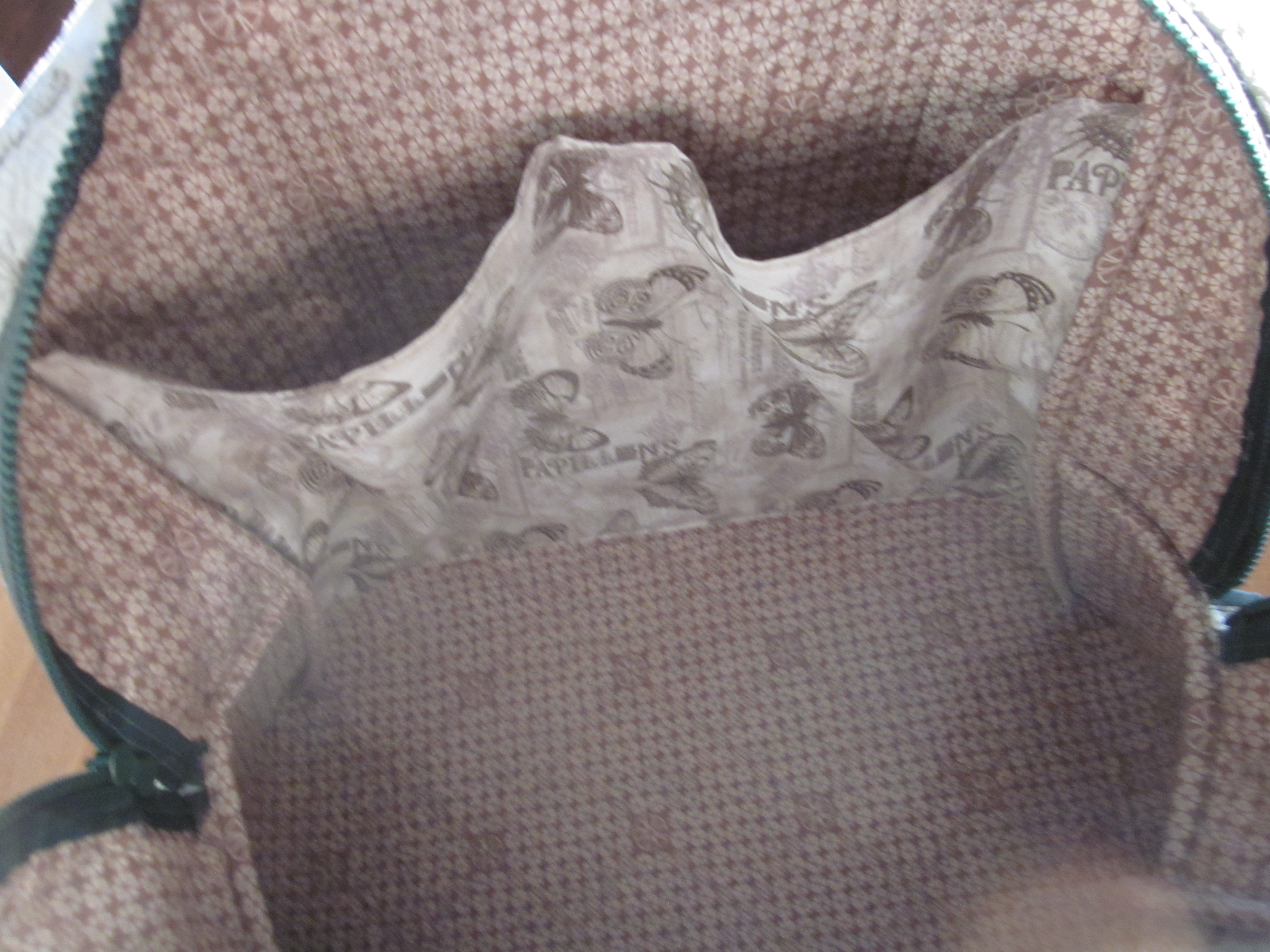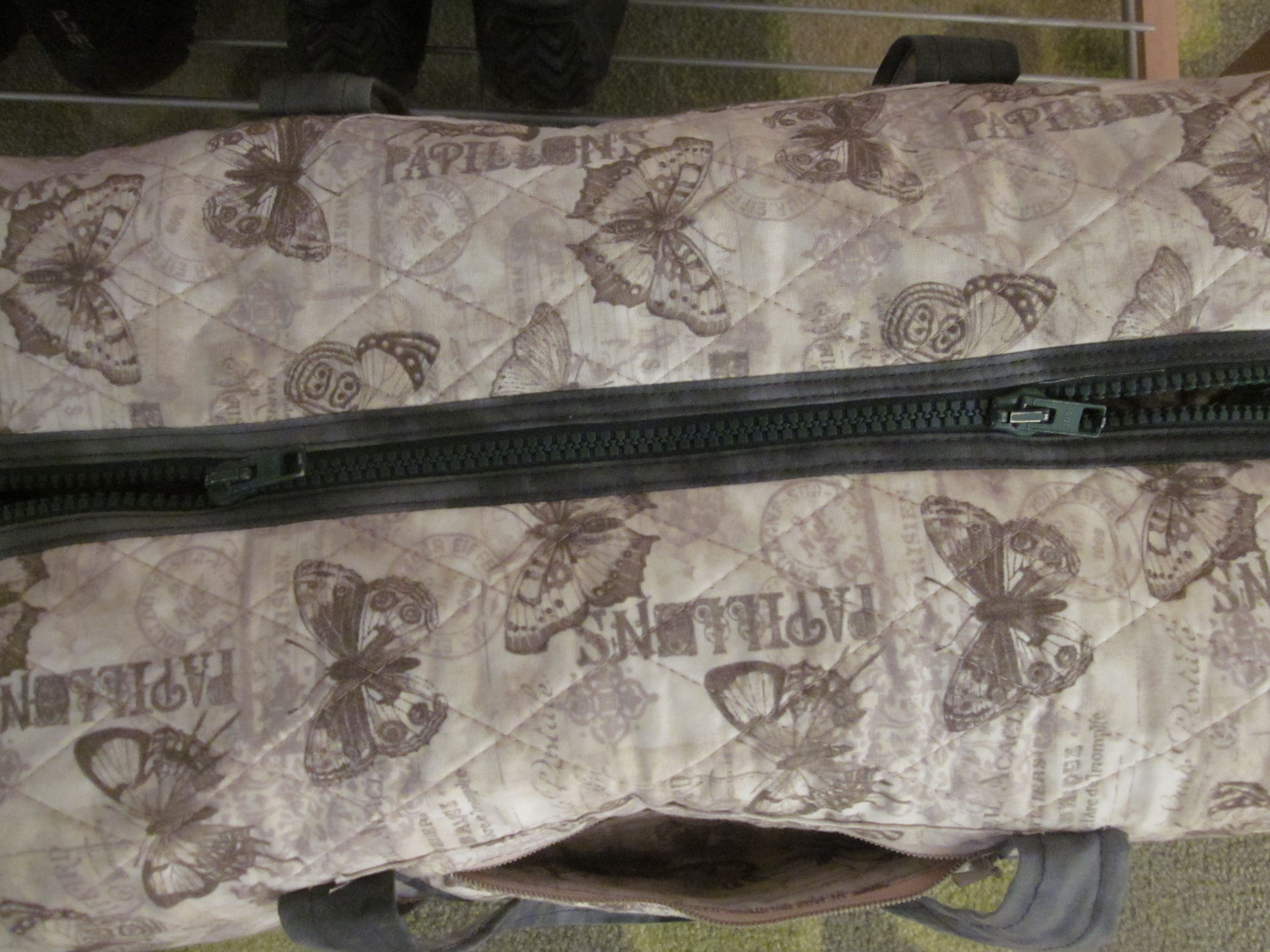 Jag köpte ett mönster till Weekendbag. Och naturligtvis tyg till det också. Nu har jag knåpat ihop det hela. Det var faktiskt mycket enkelt för mönstret var väldigt bra skrivet. Jag älskar fjärilstyget, men kanske är underdelen något lite för mörk. Men jag tycker det är jättefina handtag och flärpar. Och så hittade jag ett tvåvägsblixtlås i rätt färg och längd i min stora blixtlåssamling, det tror jag blir bra. Nu går det att öppna väskan från vilket håll man vill.