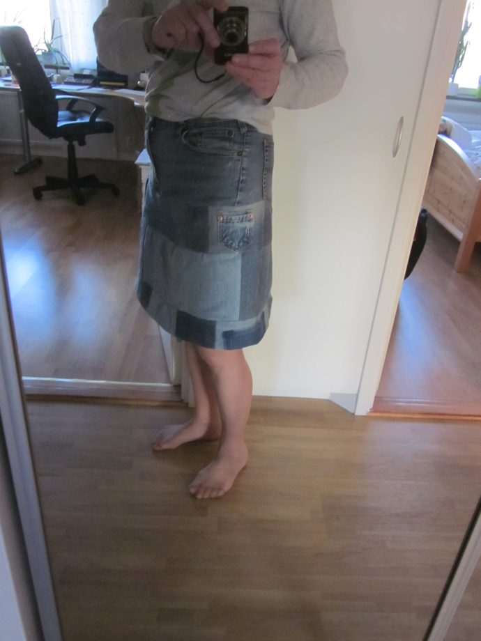 Jag fick en idé från en bekant. Hon hade köpt en jeanskjol sydd i lappteknik där överdelen är ett par byxor och sedan syr man bara dit rad efter rad till önskad längd. Och lägger dit några små veck emellanåt så den inte blir för snäv. Så här blev min.