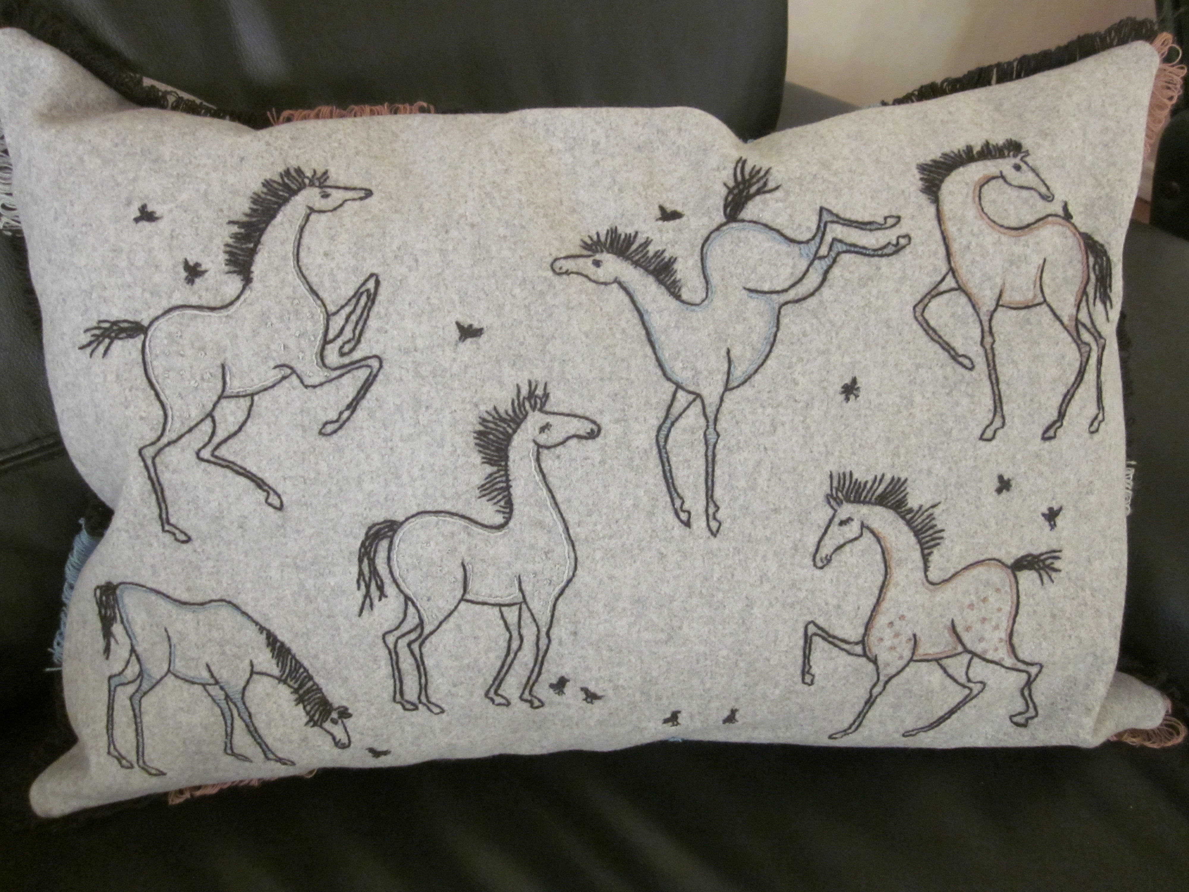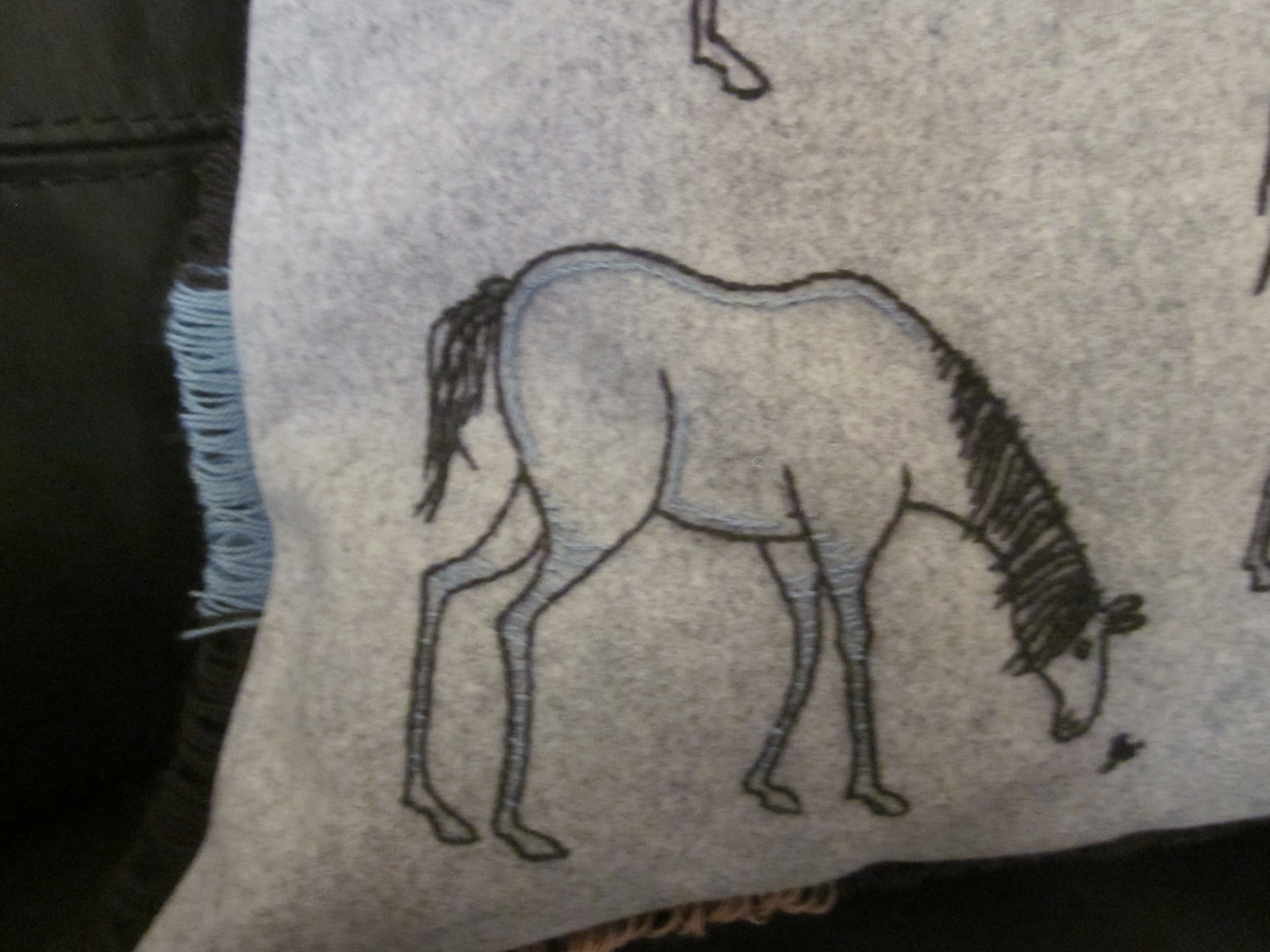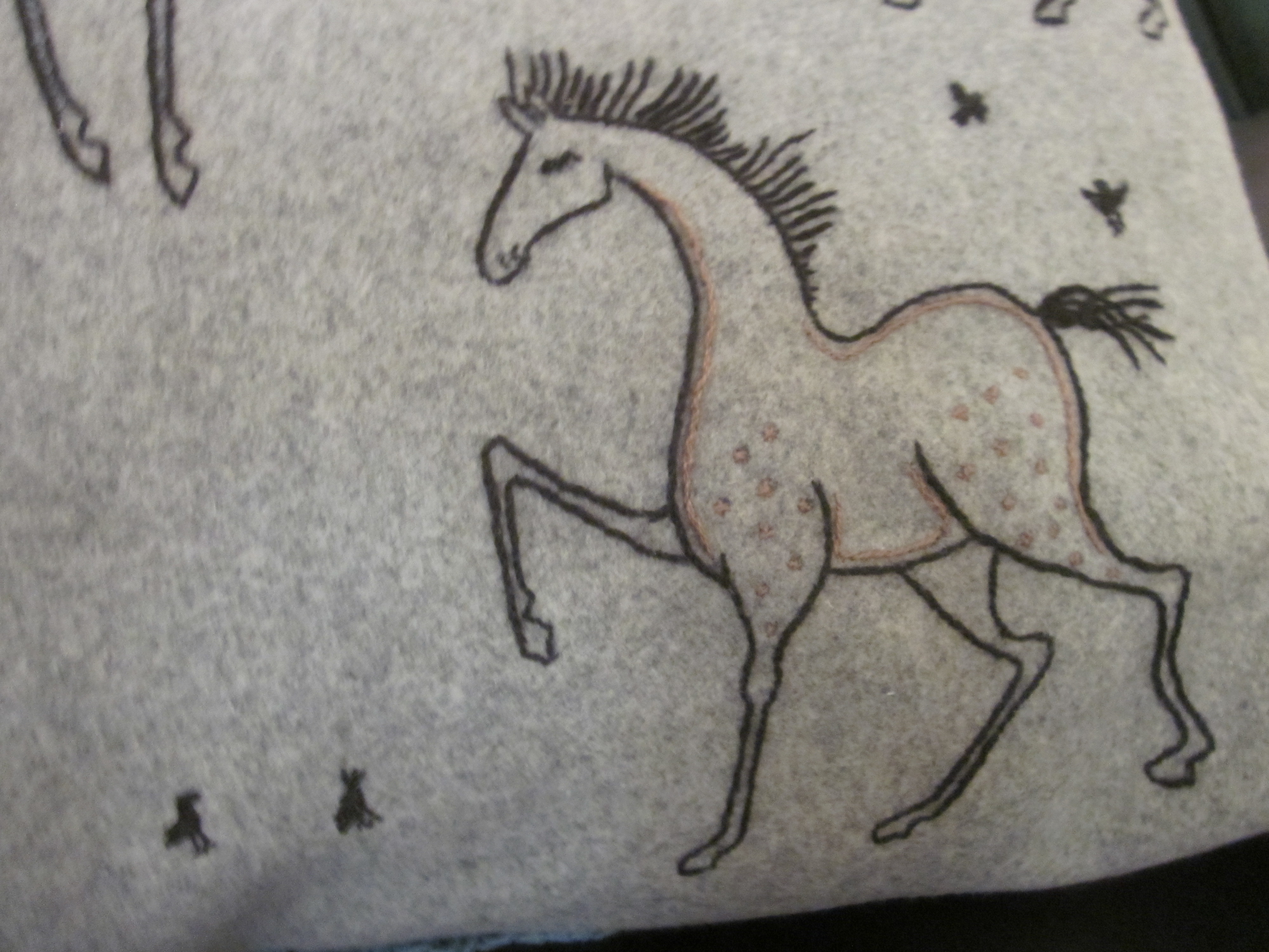 Den blev en present till syrran, för att det var så mycket hon. Ganska tjockt ylletyg som var lite besvärligt att sy i, speciellt de pyttesmå fåglarna. Man kunde inte alltid ta nålen både ner och upp i ett drag utan fick först sticka ner nålen till baksidan och dra igenom tråden, sedan upp igen.