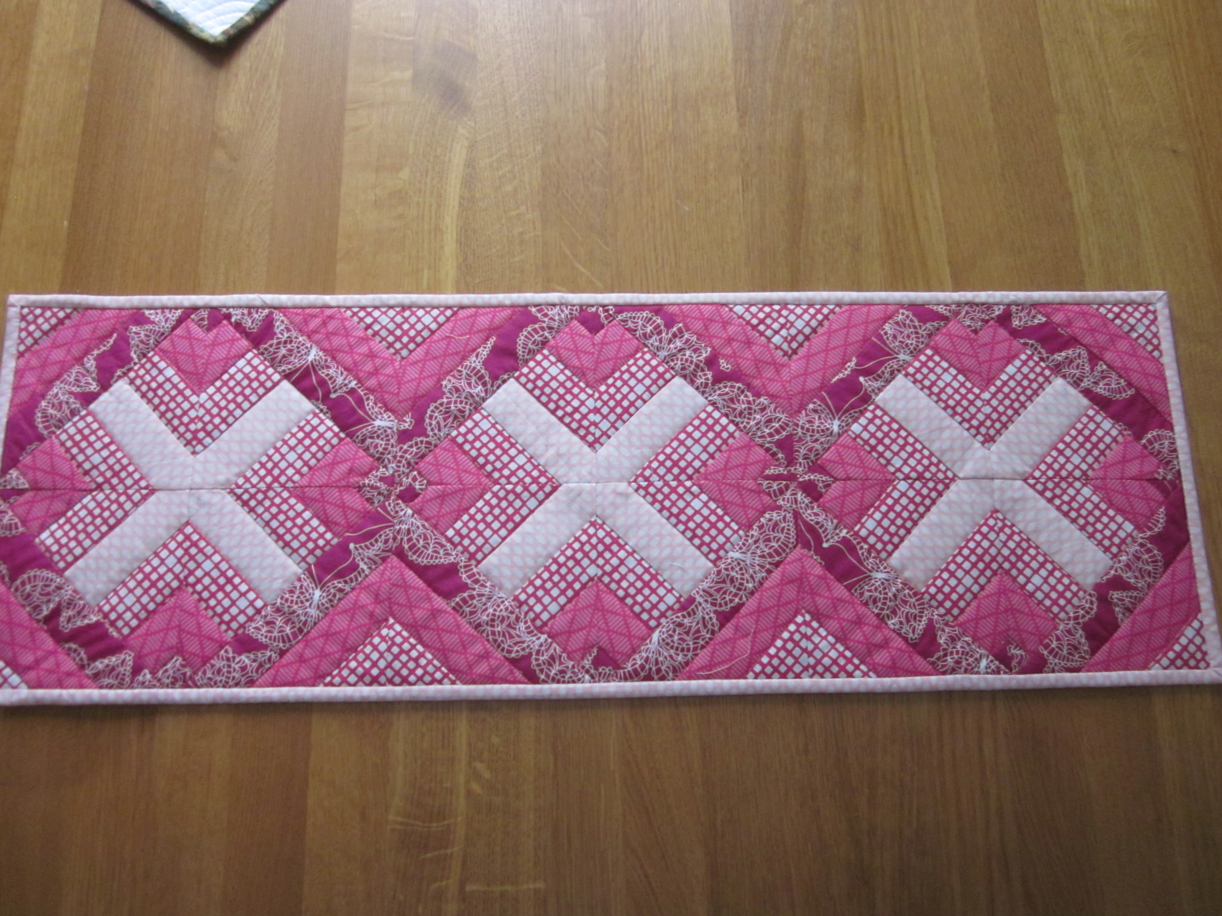 Det här mönstret såg jag i vintras på Bambis sida. Tyckte det var läckert och sydde en löpare i blått. www.helenaåhman.se... Tyvärr blev jag inte alls nöjd med färgen där, den blev alldeles för kall.