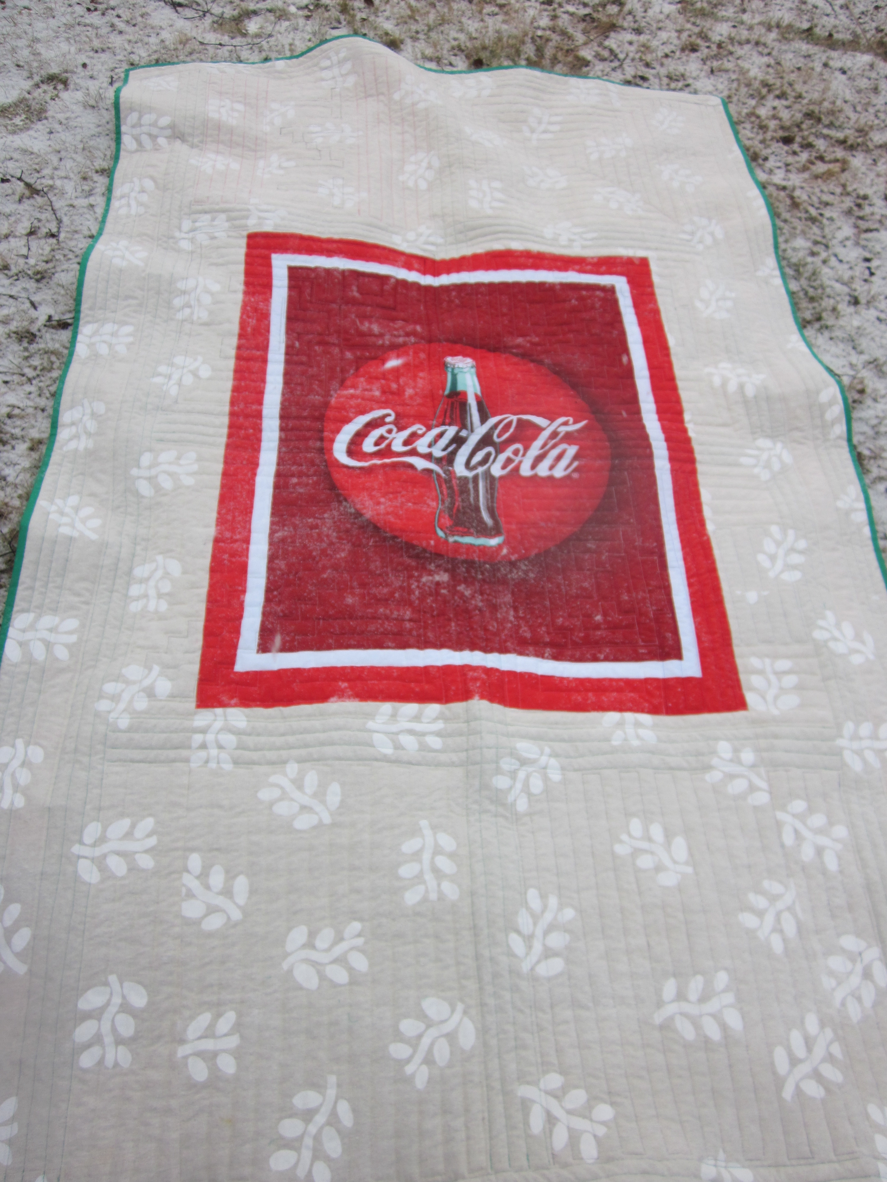 Jag gjorde ett impulsköp av ett tyg med Coca Cola-reklam för en tid sedan. När jag väl kom hem med det undrade jag varför jag köpt det, vad jag skulle ha det till. Nu fick det bli baksida på Svantes överkast, jag har fyllt ut med en gammal gardin. Har till och med kostat på mig en liten signering i ett hörn.