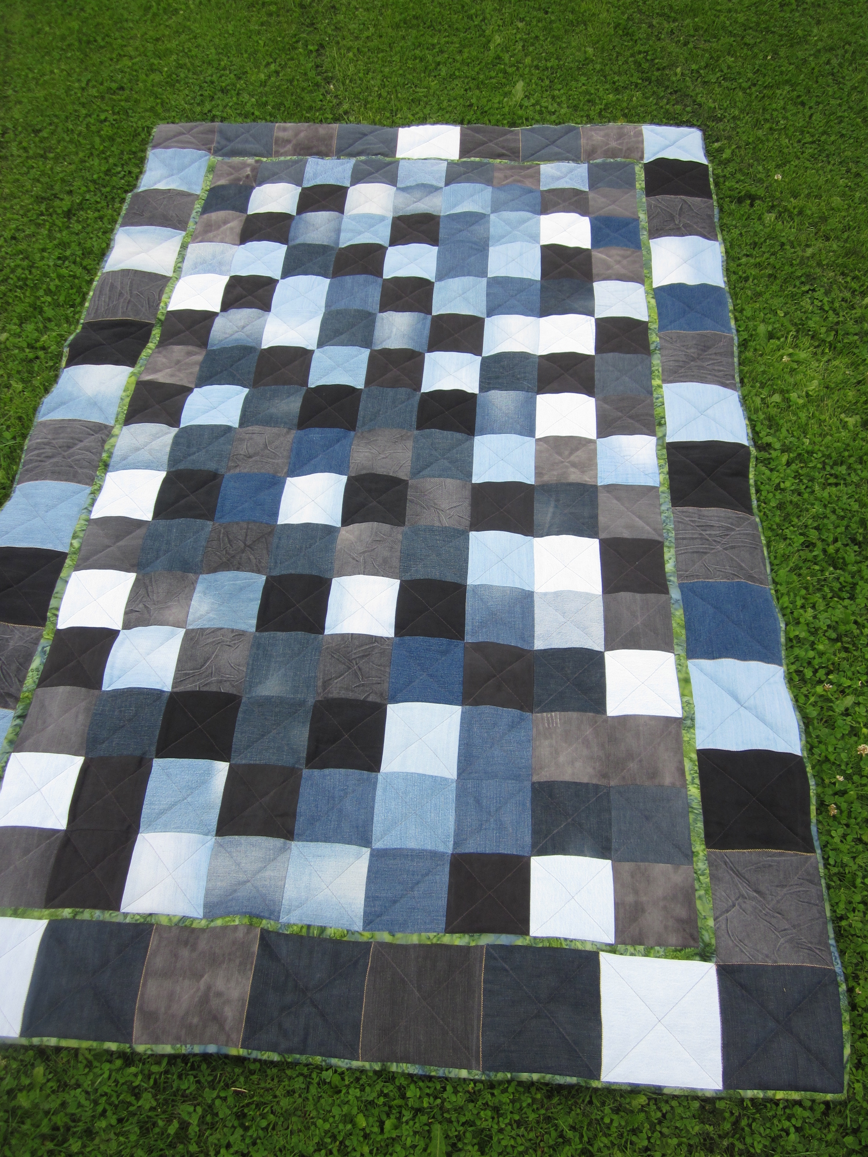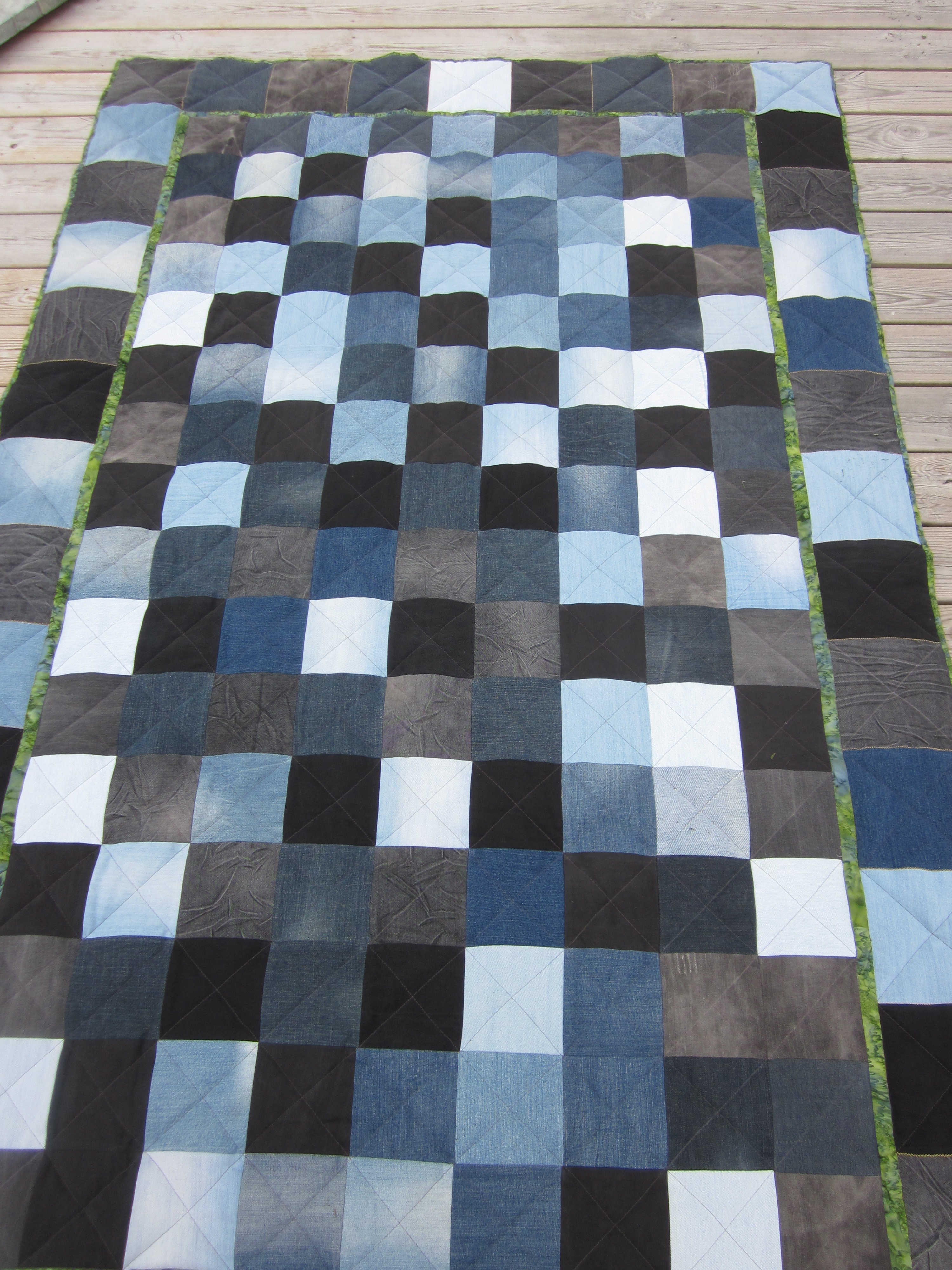 Jag började med att skära 6"-rutor. Men så visade det sig att man inte fick ut några 6"-rutor i barnjeansen, bara från vuxenjeansen. Så jag övergick till 5"-rutor. Därav "bården" med större rutor i yttervarvet. Jag hade lite tur för det skilde bara 0,5" för att få det att stämma mot varann i kort och långsidorna. Det har jag justerat med den smala gröna bården innanför de större rutorna.