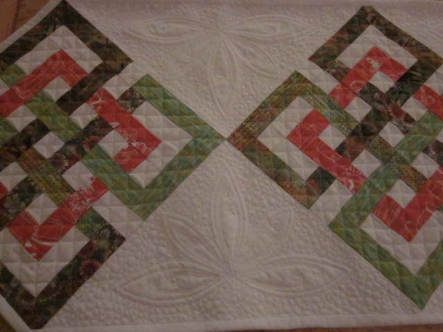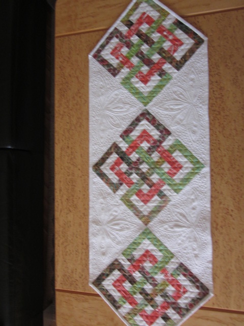 Den här duken har jag hållit på med länge. När jag började quilta den var min symaskin på värsta tänkbara humör. Jag fick superfula stygn. Endera drogs undertråden upp så det blev tygliga öglor på ovansidan. Eller så drogs övertråden ner och bildade ett enormt ormbo. Mycket sprätta och många svordomar blev det. Maskinen är i alla fall variationsrik med sina fel!