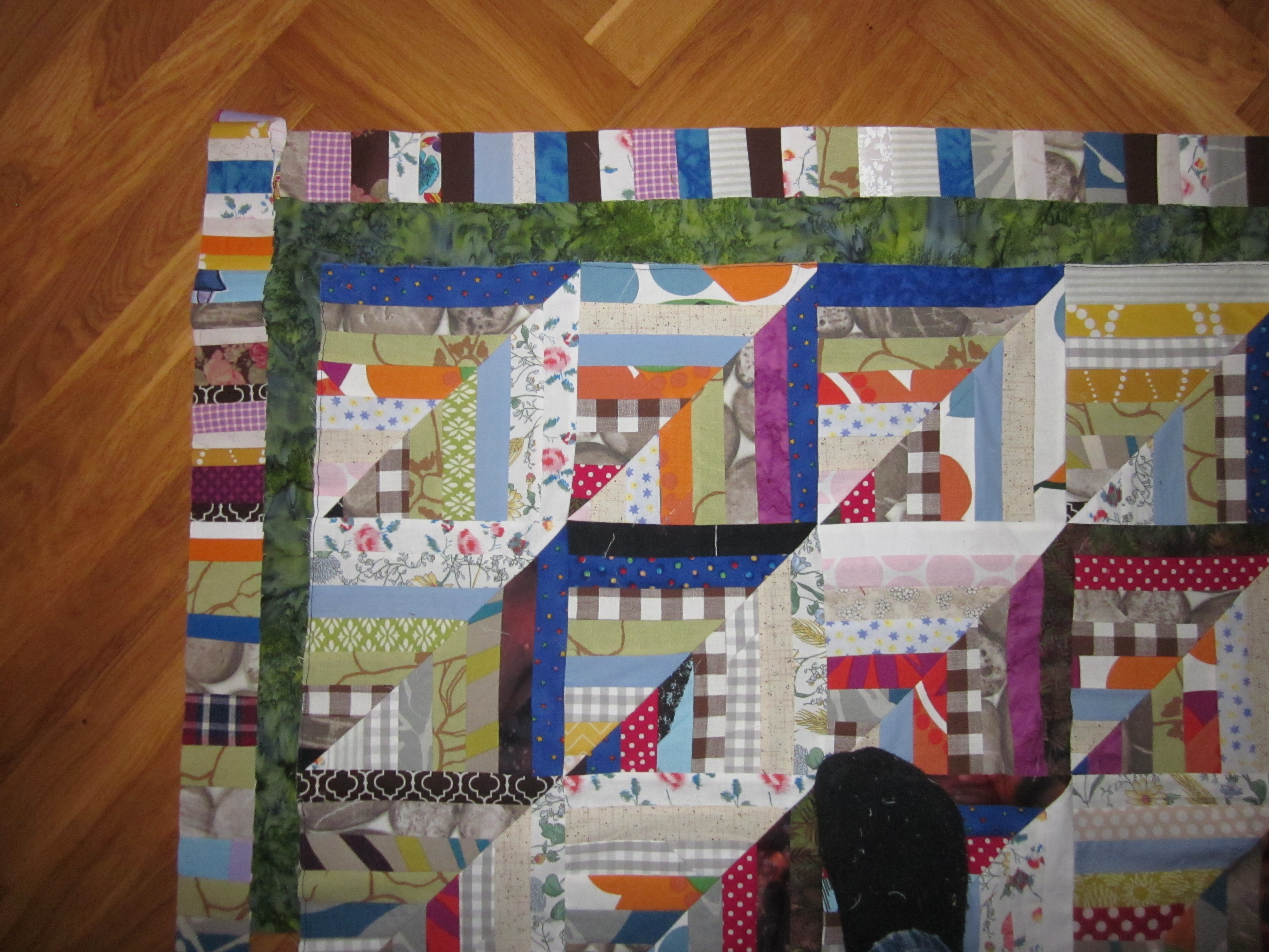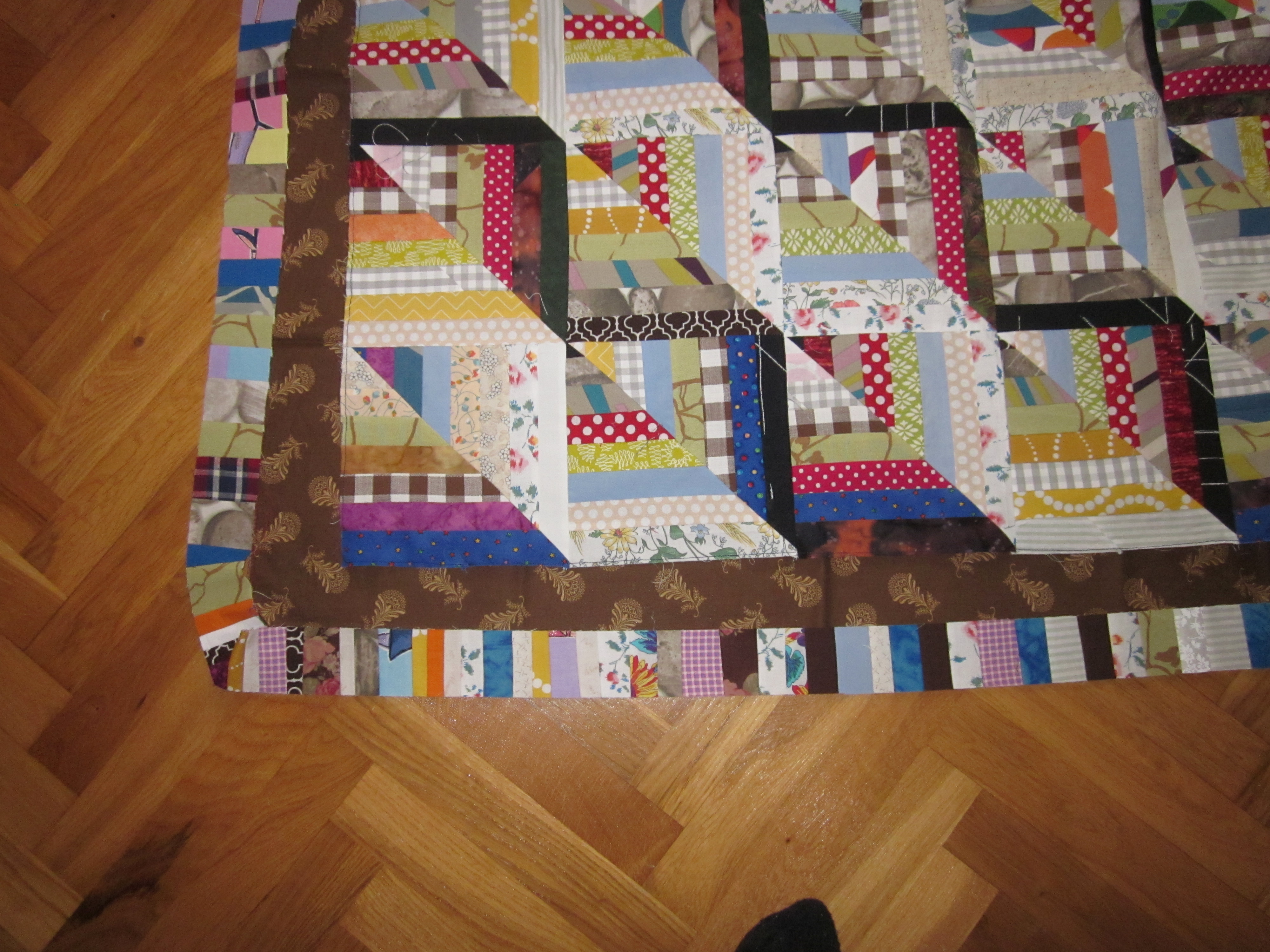 Det är den falska Log Cabin som jag sett hos janegardner.blogspot.se... som jag nu gett mig i kast med. Många remsor är det. Jag har framförallt förbrukat mina "fultyger" och det har faktiskt minskat en hel del. Ett par tre till sådana här quiltar så kanske det tar slut…Det är massor med skarvar i remsorna men det tycker jag inte gör något. Och det blir ju mindre spill då. (Sån man är. Jag längtar till att fultygerna ska ta slut, men jag får absolut inte slösa med dem!!)