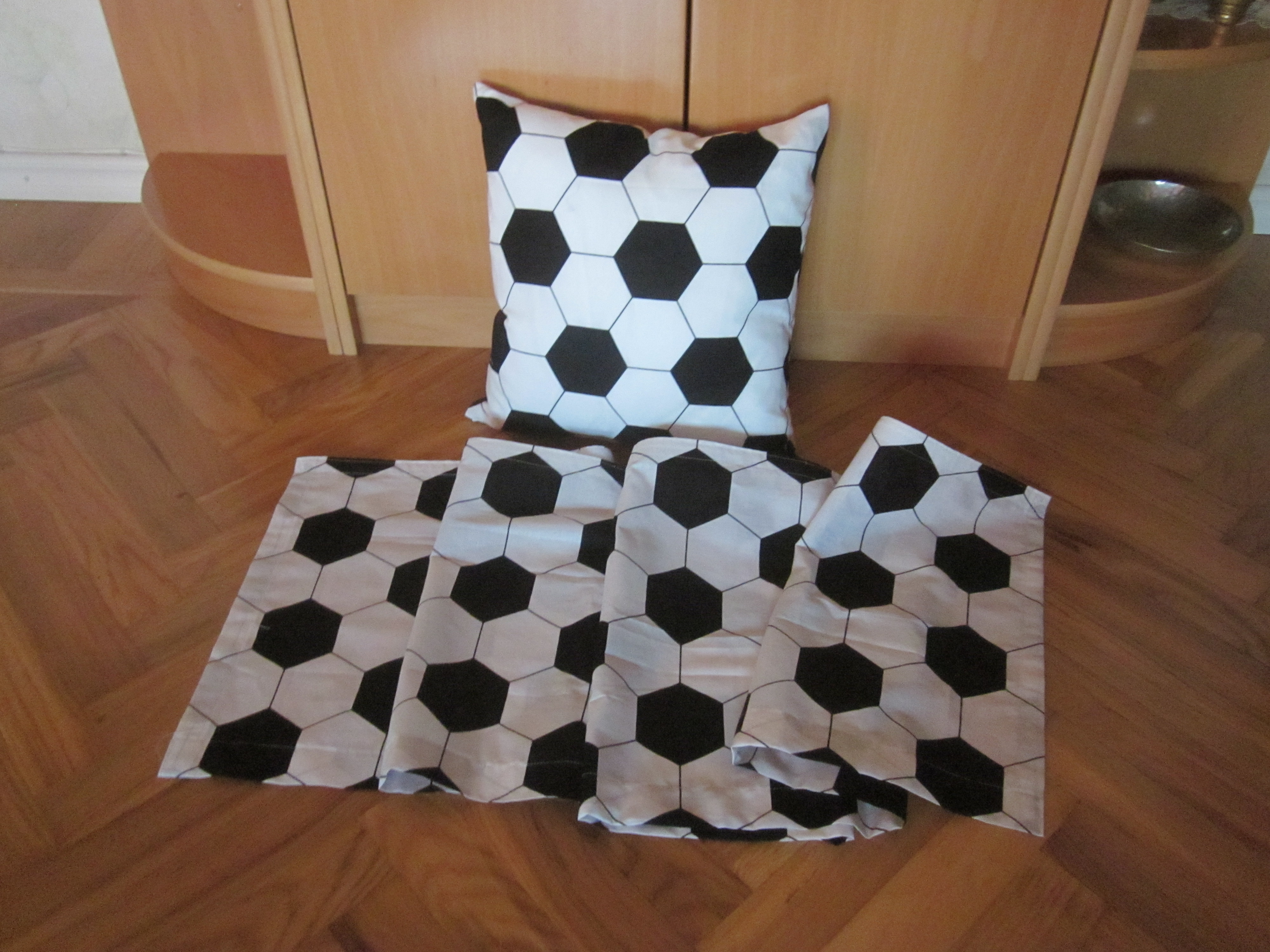 Det fotbollsspelande barnbarnets rum skulle fräschas upp. Jag fick i uppdrag att sy gardinen. Det blev så pass mycket tyg över att det räckte till en kudde.