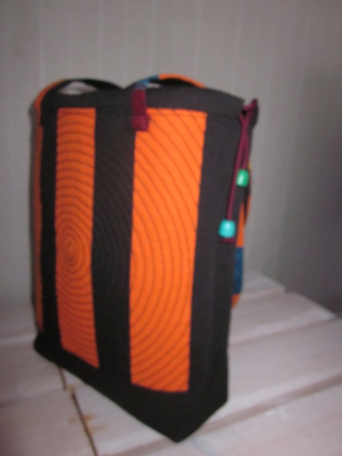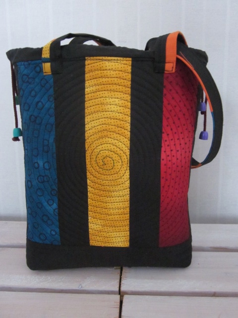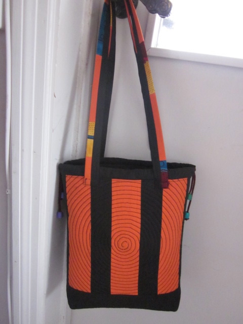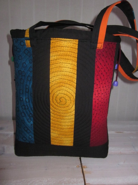 Maria/Majas tyg var så fint så jag hade svårt att sätta kniven i det. Tyckte liksom att så lite som möjligt skulle gå bort i sömsmåner. Men lite rester blev det efter att jag delat remsat i tre bitar, de är inpusslade i handtaget. Sedan testade jag "rondellkörning" vid quiltningen. Avslutade med anoraksnöre i dragskon med ploppar i olika färger. (klicka på bilderna så de blir större.)