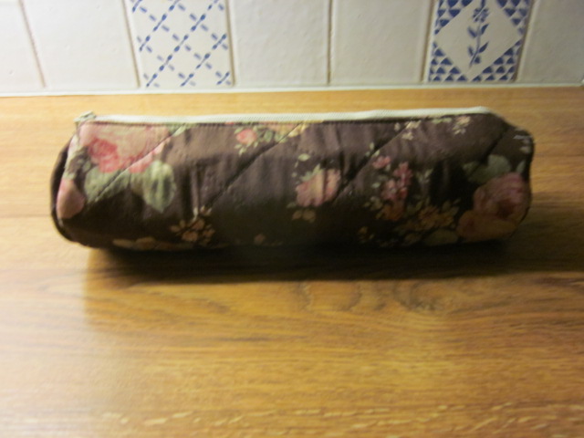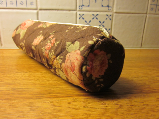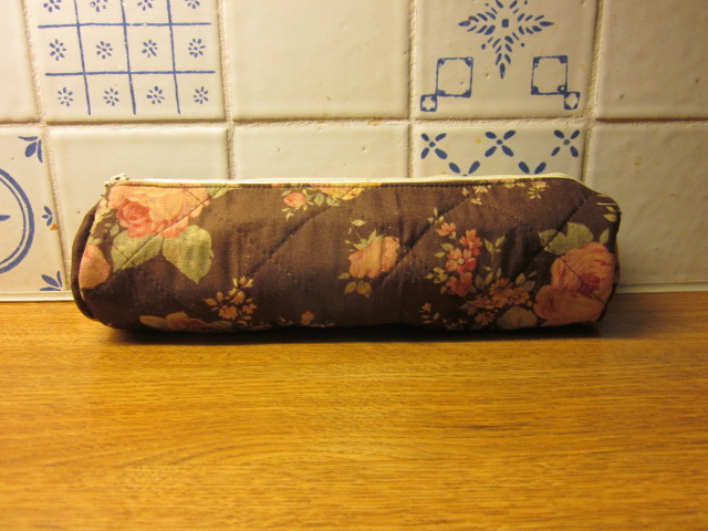 Av det mindre biten som är upptill på fotot gjorde jag denna nesse. Den blev lååång och smal. Typiskt pennetui tror jag. Det var väldans knöligt att sy dit kortsidorna. Skulle nog bara sytt av hörnen istället. Men man lär så länge man lever. ;)
