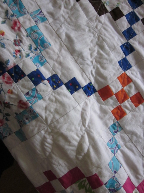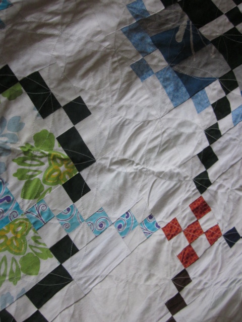 Ja den här quilten blev alltså ett påslakan. Blocken var superkul att sy. Sen slaktade jag ett tunnslitet påslakan och tog som baksida inför quiltningen. Inget mellanlägg. Och det var då det roliga tog slut och jag började svära för mig själv. Och sucka och stöna. Men jag har inte orkat sprätta så mycket som jag borde så det blev VÄLDIGT bubbligt där övertråden drar ihop tyget.
