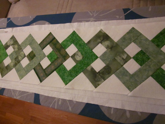Stärkt av att lyckats lista ut hur Bambi gjort så testade jag en duk till. Den här är jag jättenöjd med. Har kommit fram till att jag är väldigt fascinerad av kedjeeffekter (och 3D). Och eftersom min symaskin fortfarande är på service (fjärde veckan nu) så har jag sytt allt på min gamla maskin. Och tänk, på den går det att quilta. Nu skulle jag vilja quilta något jättefint på den här duken, men jag vet inte vad. Därför ligger den än så länge bara och väntar.