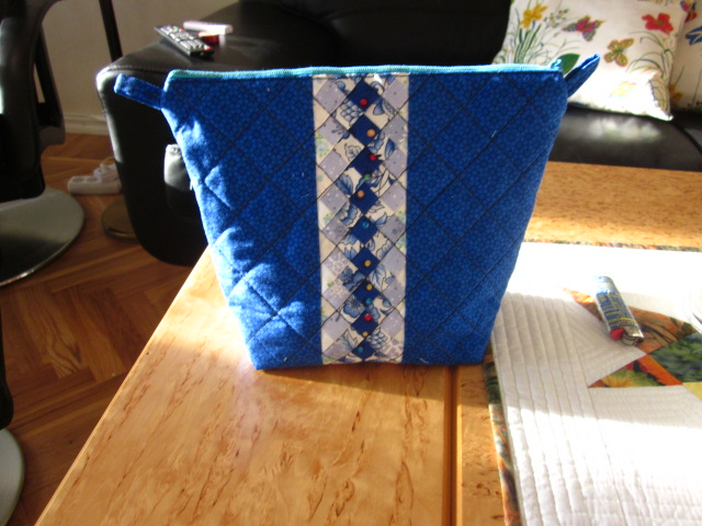 Jag rotade igenom mina mönster och hittade det allra första jag köpte. Det köpte jag från Mias Quiltbod som tyvärr inte finns kvar längre. Jag ville testa den där mittenremsan och det blev denna necessär. Jag tycker om det där mönstret.