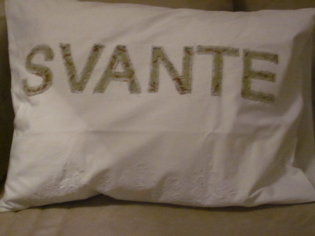 Svante beställde en kudde som det stod Svante på. Jag återanvände överdelen av ett gammalt överlakan med ett broderat "S" och så sydde jag dit "SVANTE". Jag har bett honom att rapportera hur det går att sova på den. I värsta fall får man väl vända på kudden, om man tycker att det är för många sömmar som stör.