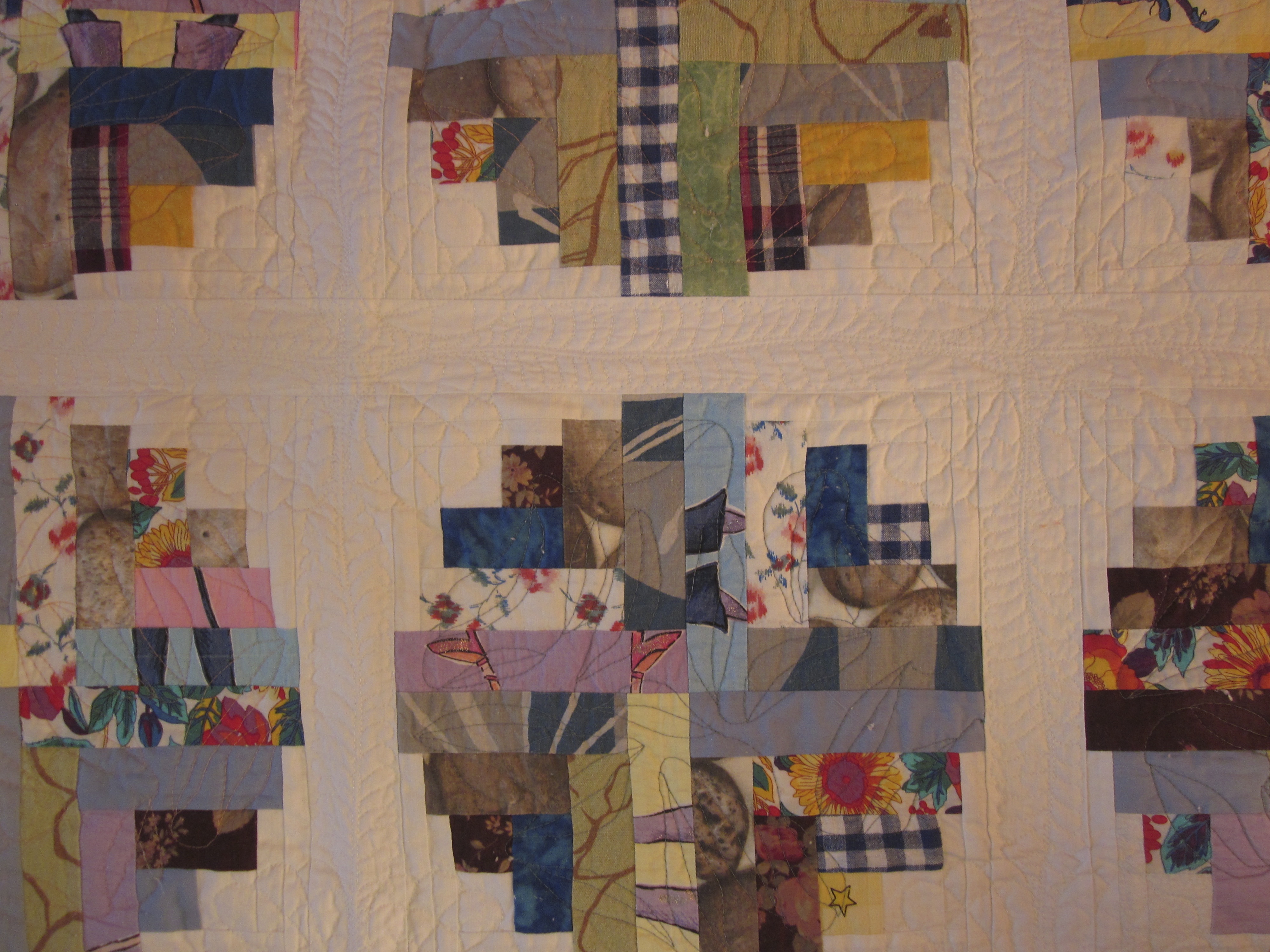 Det vita är tätt quiltat med någon slags "blomma" i mitten och så min variant av fjädrar däremellan. Själva blomman ritade jag upp med sån där penna som man tar bort med vatten, resten är helt på frihand. Det tog en enorm tid att quilta men jag är faktiskt hyfsat nöjd med resultatet. Visst, det syns fortfarande att jag är nybörjare. Ska träna mera på fjädrar, det går att få dem mycket finare det har jag sett massvis med exempel på.
