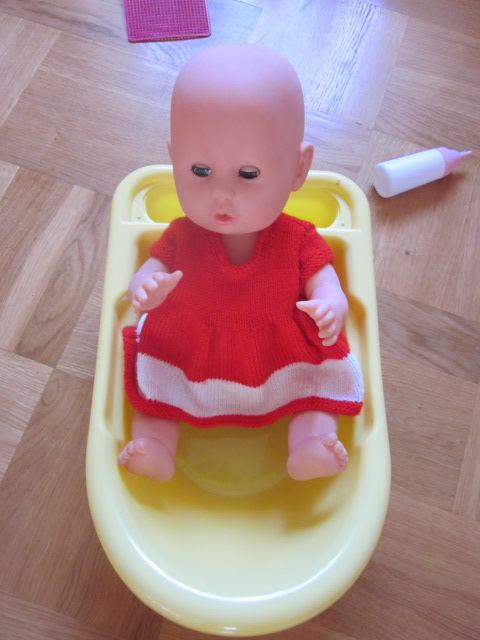 Var o hälsade på barnbarn i helgen och passade på att fotografera en dockklänning och byxa som jag stickade tidigare i höstas. Ja, byxan visar hon förstås inte. Hon är väl lite pryd av sig.
