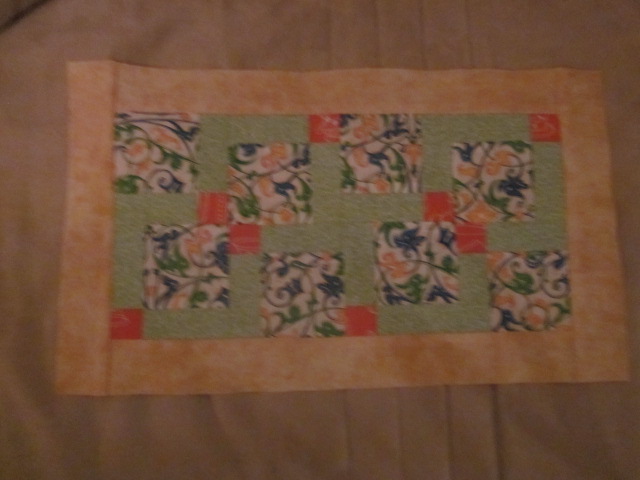 Innan jag gjorde blocken började jag på denna duk. Upptäckte nu när jag fotograferade att det gula tyg jag trodde jag lagt undan till kantningen är taget till blocken. HUR klumpig får man bli! Jag tyckte duken blev för färgrik och ville inte lägga till någon mer färg. Men det blir det nu. Jag har alldeles för bråttom att gör mig av med scraps! Jag har även gjort slut på det gröna till blocken så jag blir tydligen tvungen att lägga till ytterligare en färg. Det får med andra ord bli en riktigt färgrik vårduk.