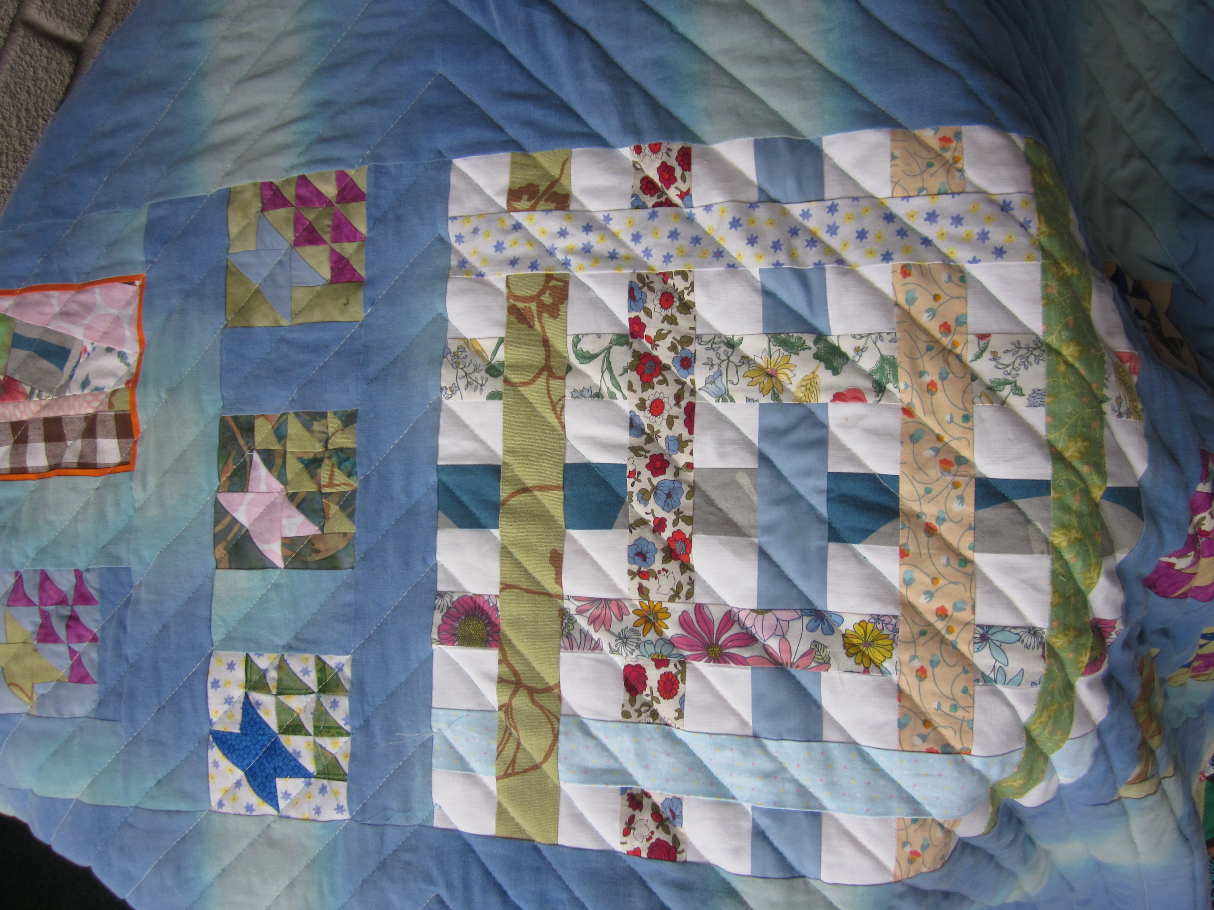 Nu är jag färdig med mitt scraptäcke. Jag är riktigt nöjd med det. Jag började ju fel, sydde ihop det jag hade till en liten miniquilt och tänkte att jag skulle bygga vidare vartefter scrapsen "förökade" sig. Men det gjorde att man i mitten kan se en "egen" färgruta. Där hade jag väldigt mycket gröna scraps. Så därefter lade jag mina fyrkanter på hög vartefter jag sytt ihop dem. När jag sedan hade tillräckligt många såg jag verkligen till att de blandades ordentligt. Quilten är ca 2,20 x 1,40 m, ett bra mått tycker jag. Den består av 40x26 st fyrkanter = 1040 stycken. Alltså 2080 trekanter.