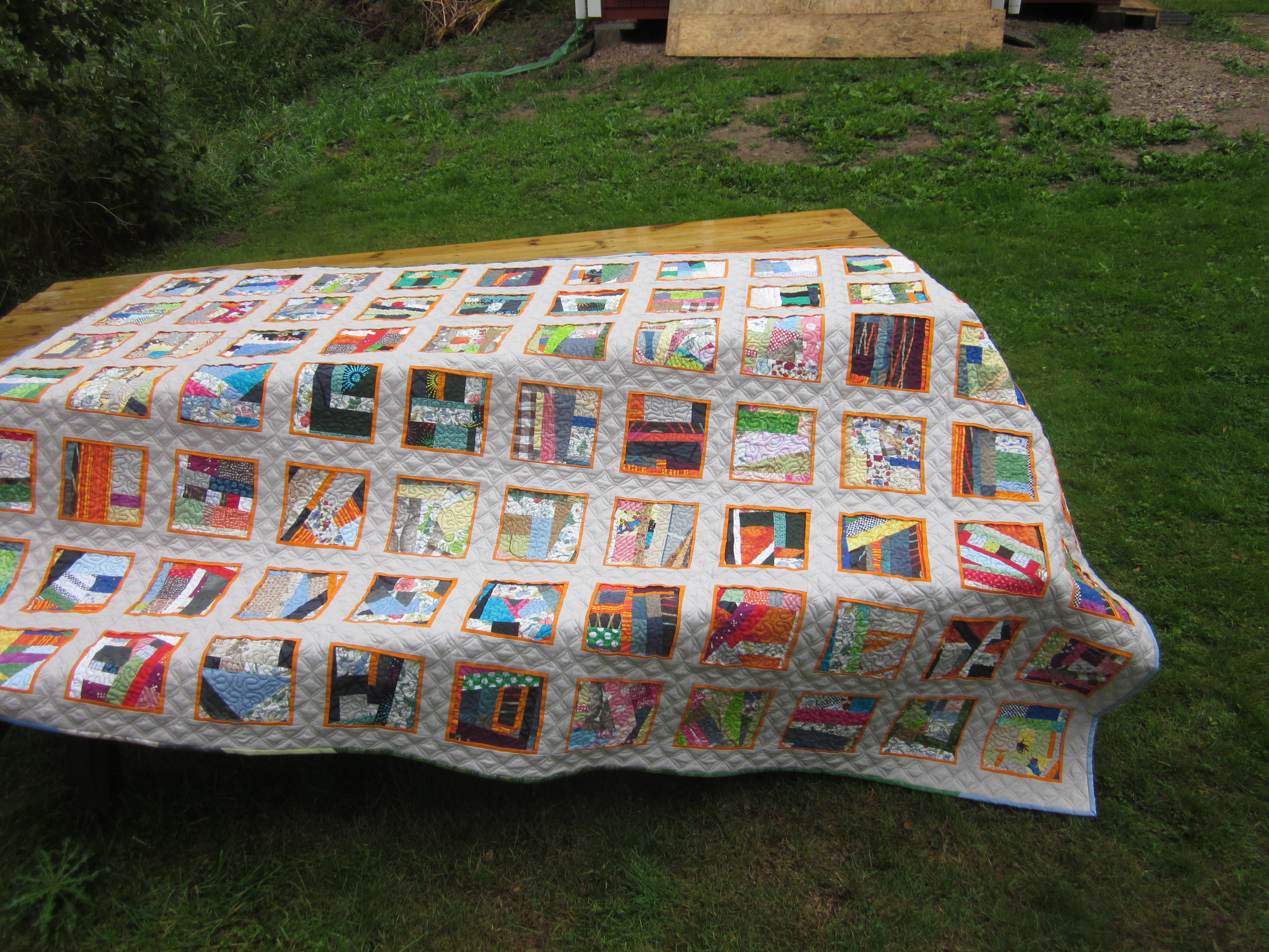 Summa summarum är jag väldigt nöjd med den här quilten. Här en länk till Gun och hennes Scrap Happy Day rutigt.wordpress.com. Ska gå dit och kolla nu. Se om jag hittar flera idéer på vad man ska göra med alla scraps. För tänk, trots att jag inte sytt speciellt mycket sedan denna quilt blev färdig så ligger lite nya scraps där och väntar!