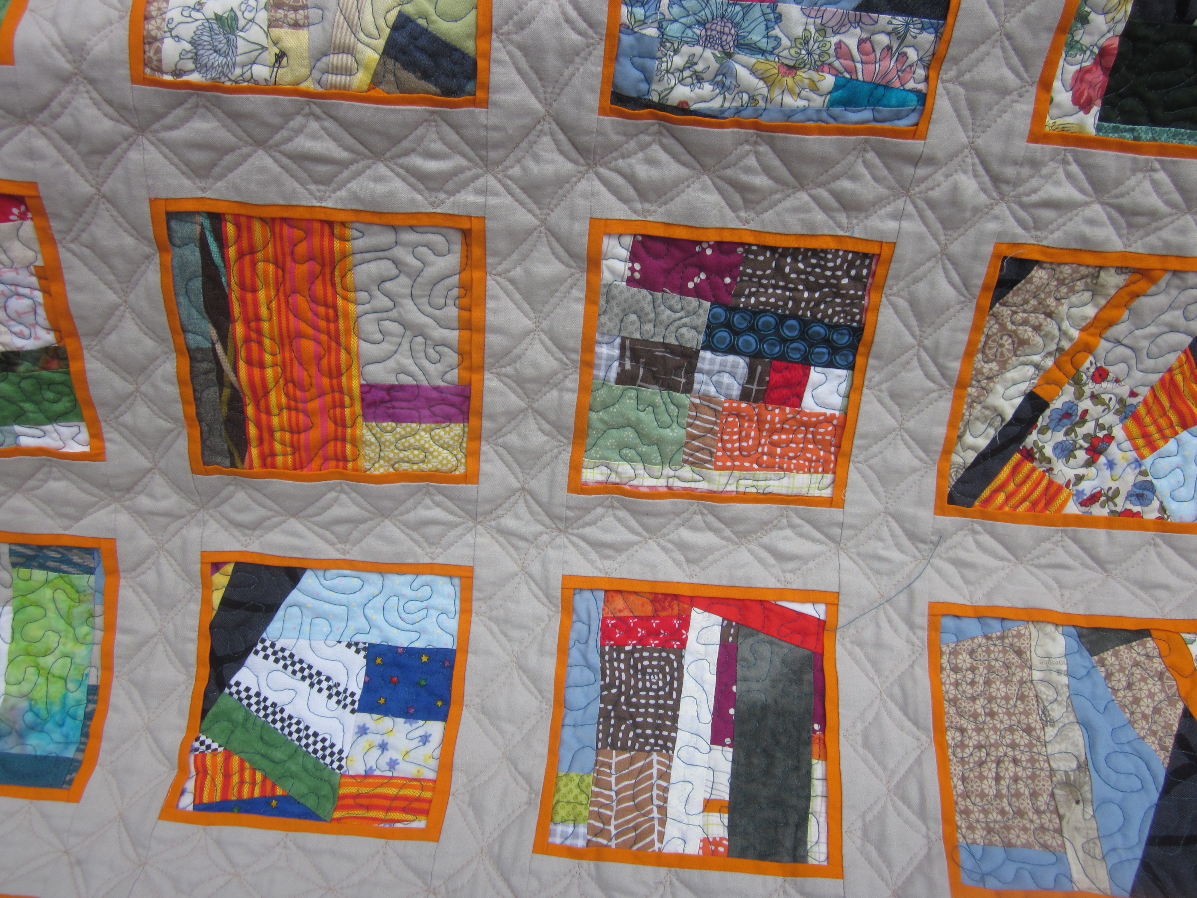 Till den här lyckades jag verkligen göra slut på riktiga småsmulor. Jag har tagit reda på varenda liten tygbit jag hade, har blandat färger hej vilt. Har försökt hålla ihop det hela med grått emellan och en orange tittkant på varje ruta.Men jag fick ett litet problem med det gråa mellan rutorna, hade köpt för lite. Men jag lyckades hitta ett tyg som stämde väldigt bra i färg så nu vet jag inte längre var den lilla malören hamnade.Visserligen var det nya tyget lite stretchigt, men det handlar bara om 30-40 cm så det är inget som märks.