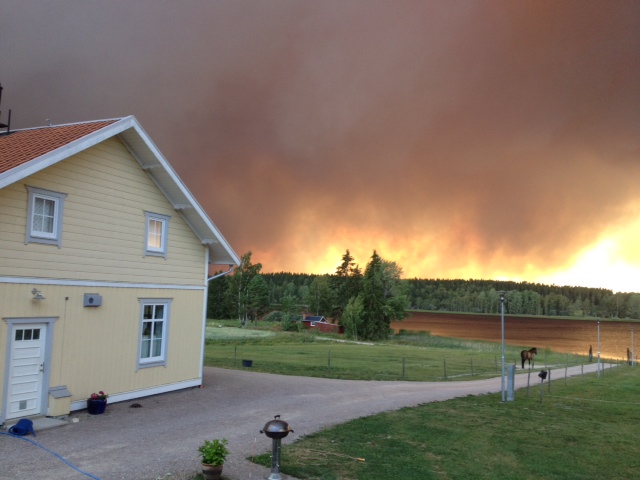 Sen gick det fort. Dessa bilder är tagna av grannen fyra-fem timmar efter att jag åkt. Min stuga ligger nere mot sjön vid de höga träden. Sjön är max 200 m bred. Riktigt riktigt otäckt. Grannarna började med att evakuera hästen sedan åkte de tillbaka och alla där uppe har varit med i frivilliginsatserna och gått brandvakt och släckt uppblossande bränder.