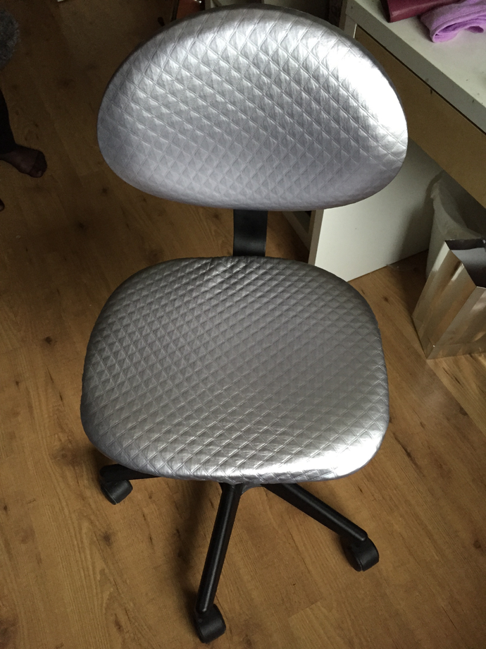 Leia vill ha silver och glitter i sitt nya rum. Därför skulle hennes två slitna stolar kläs om. Vi hittade ett silvertyg, definitivt inte möbeltyg. Men det var värt ett försök. Det var ett mycket svårjobbat och halkigt tyg. Och alldeles för tjockt när det skulle spännas fast på ryggstödet. Men till slut blev det hyfsat.