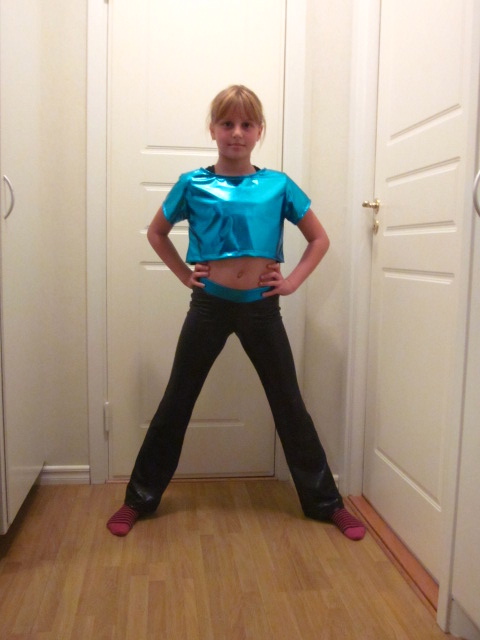 Här är Leia i den superglittriga utstyrseln hon ska ha vid sin singeldans. Mycket svårt tyg att sy i. Och det blev hål kvar efter knappnålarna så jag kunde bara nåla i sömsmånen. Men läckert blev det!
