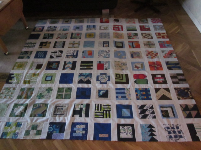 Så sakteliga avancerar jag med min Tula Pink-quilt. Nu har jag sytt ihop toppen och jag är faktiskt mycket nöjdare än jag trodde jag skulle bli. Jag hade ju konstaterat att jag använt alldeles för många olika färger och mönster och trodde inte det skulle gå att få nån ordning på det hela. Men jag tycker det blev riktigt bra.