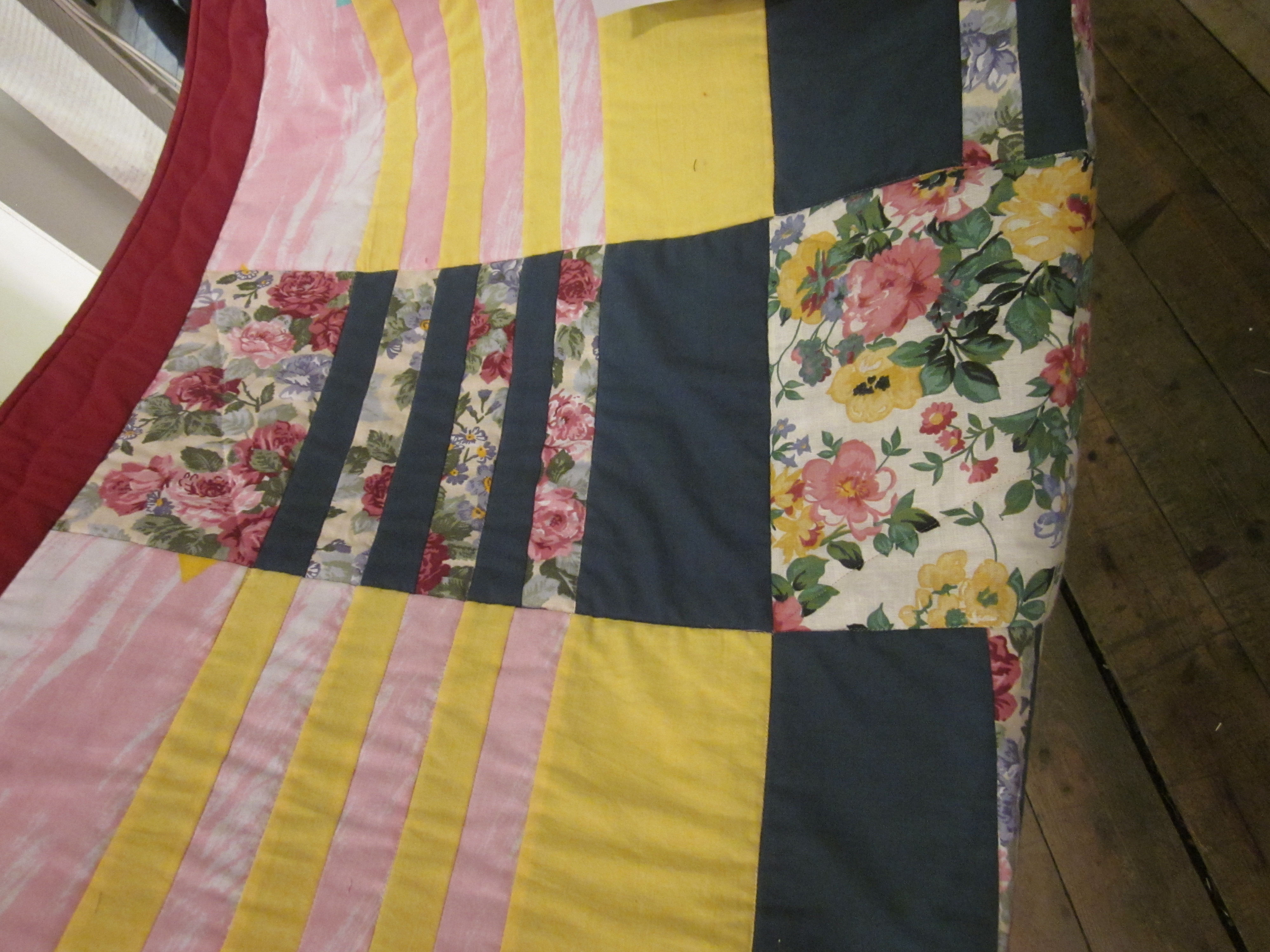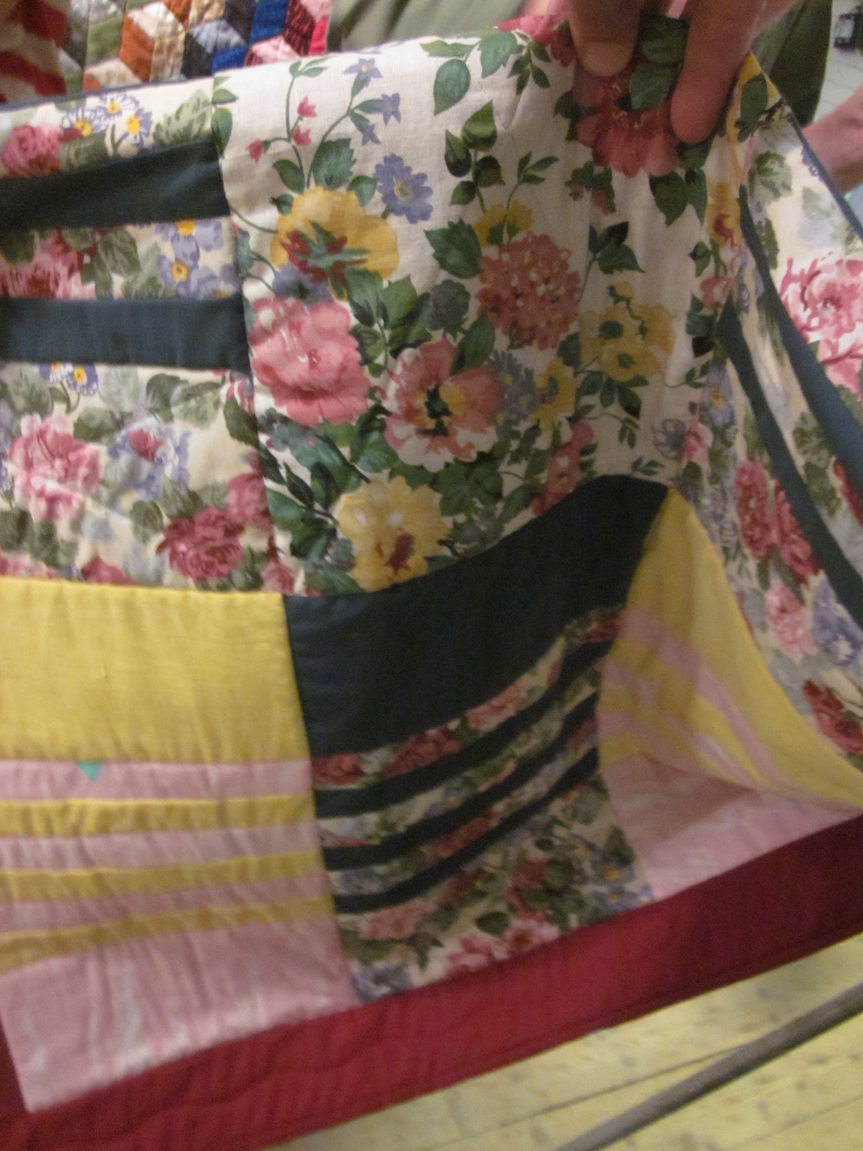Tygerna är tvättade och fållar är bortklippta. Mönster är bestämt. Det blir en stöld från en quiltutställning vi såg i Ängelsberg i somras. Quilten låg hopvikt under andra quiltar så vi såg den aldrig i sin helhet. Jag har bara dessa två foton på den, får se vad det kan bli av det. Så vi tackar denna sömmerska från Ängelsbergstrakten för idén som föll min dotter i smaken.