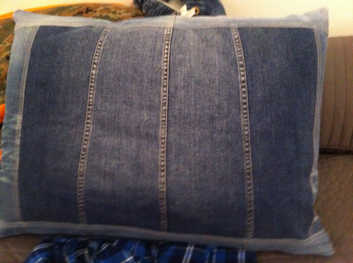 Emil, som skulle bli ägare till den nya kudden var något lite tveksam. Hur gosig blir kudden i jeanstyg? Med tjocka sömmar, knappar och nitar. Men jag som så gärna ville ha något att sy bedyrade honom om att inga knappar skulle var kvar. Kanske nån liten nit men då skulle jag se till att den kom längst ut i nåt hörn.