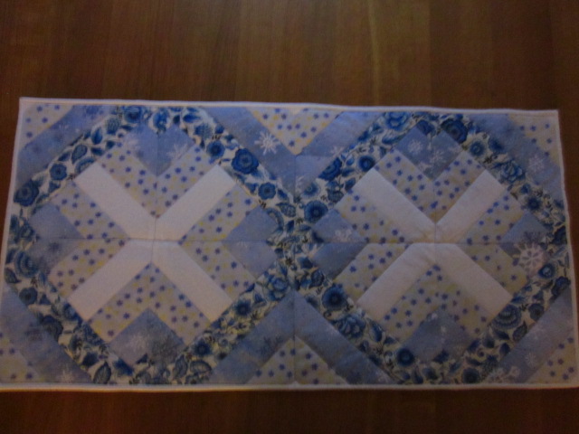Det här mönstret såg jag i vintras på Bambis sida. Tyckte det var läckert och sydde en löpare i blått. www.helenaåhman.se... Tyvärr blev jag inte alls nöjd med färgen där, den blev alldeles för kall.