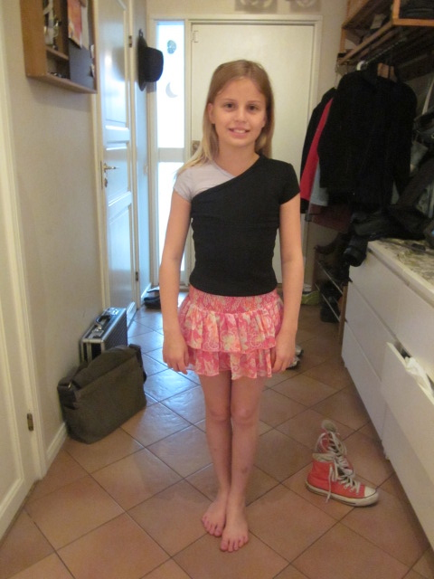 Här är ett första försök att sy en top till Leias discodans. Tyvärr blev den för liten. Modellen är ju sådan att det blir dubbelt tyg under armarna och eftersom jag sydde den utan att prova en enda gång så blev det som det blev. Den är för trång i ärmhålen. Men det är billigt reatyg jag köpt så det är ingen fara. Nu ska jag testa en lite större storlek och se om jag kan få till det.