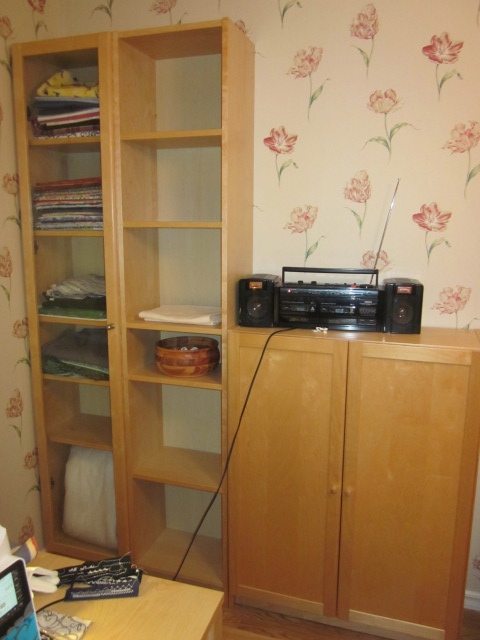 I vänstra högskåpet syns hela min tygsamling. Skrattretande litet jämfört med vad många andra visat upp på sina bloggar. Men jag är på G! :)