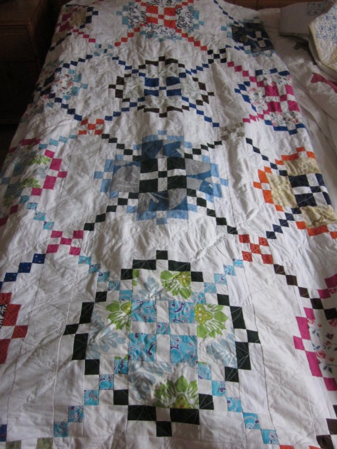 Ja den här quilten blev alltså ett påslakan. Blocken var superkul att sy. Sen slaktade jag ett tunnslitet påslakan och tog som baksida inför quiltningen. Inget mellanlägg. Och det var då det roliga tog slut och jag började svära för mig själv. Och sucka och stöna. Men jag har inte orkat sprätta så mycket som jag borde så det blev VÄLDIGT bubbligt där övertråden drar ihop tyget.