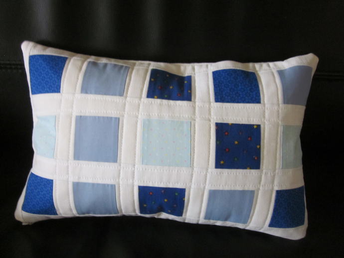 Jag hade en liten restbit liggande av dukvadd. Så jag tyckte det var passande att göra en duk av det. Storlek 43x28 cm. Och jag ville ha den blå. Vet inte riktigt varför, det var nog mest för att jag hade flera blåa tyger i scrapshögen. Sagt och gjort jag skar ut små fyrkanter, sydde ihop med vitt emellan och rakquiltade det hela.