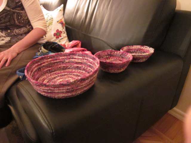 Tidigare i höstas gjorde jag såna här "snörskålar". Jag skaffade mig en laddning passpoalband och sen sydde jag på löpande band. Ett rutigt rödbrunt tyg som även det kom från mammas lådor blev dessa skålar.