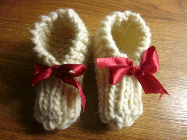 Jag köpte "halksocka på burk" och fyllde i prickarna på undersidan. Trodde att jag nu fixat de bästa och finaste tofflor hon kunde önska sig. Haha, de var för små. Som tur var gjorde jag även en stickad variant. Jag använde restgarn som legat i min låda i sisådär 30 år. Det är nämligen rester från att jag sickade lovikkavantar till mina egna barn. Den som spar han har! Men eftersom lovikkagarnet inte var rött som Doris önskemål så försökte jag rätta till det lite grann med en röd rosett. Hoppas hon tycker om dem.