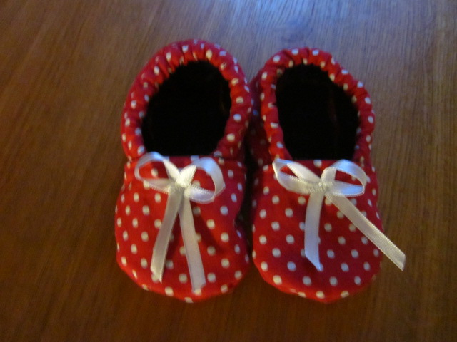 Nu har jag sytt ett par till röda tofflor. Hoppas att de passar bättre. Fast min känsla är att de nog blev lite för stora. Men då finns ju i alla fall möjligheten att växa i dem.