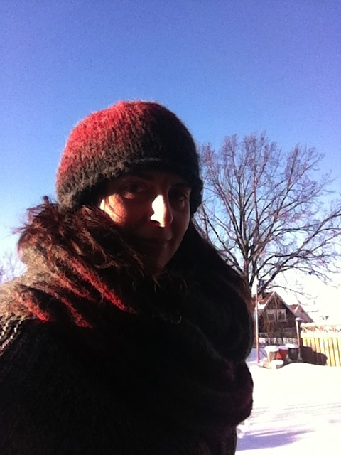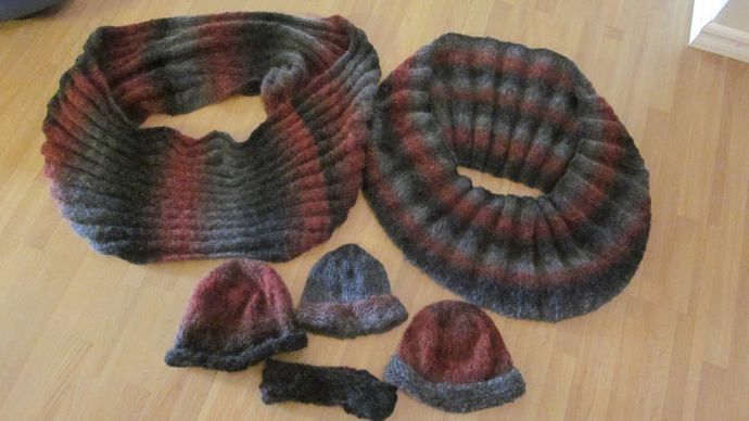 Jag skulle sticka en jättesjal till Tina. Garnet såldes bara i 350 grams nystan. Så när halsduken var klar syntes det klart att det skulle räcka till ännu en halsduk, denna gång till Leia. Och så blev det två mössor också och ett pannband. Sen var det mindre än en halvmeter kvar av nystanet.