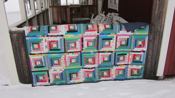 Jag fortsatte att sy som en tokig på min nya symaskin. Gav mig i kast med ett överkast till dubbelsängen i stugan. Fortfarande bara Blockhus, det var det enda jag kände till. Och fortfarande tygrester från tidigare års sömnad.