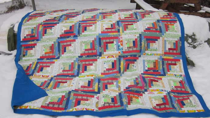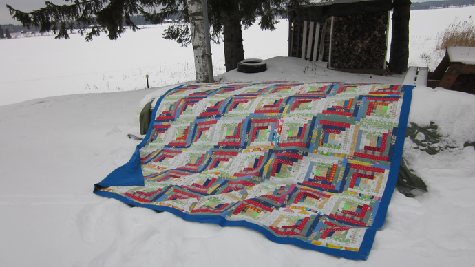 Men nu hade mamma kommit på att jag börjat sy lapptäcken så hon kom över med två stora kartonger med sina tygrester och det blev följande täcke.