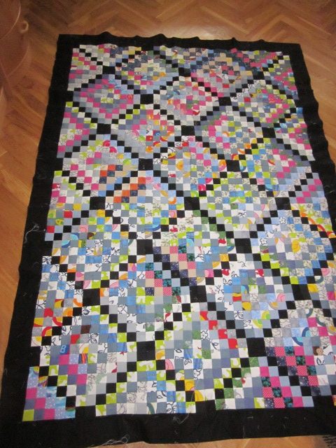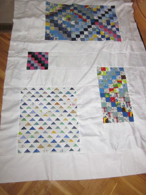 Jag har sytt lite också. Toppen Scrappy Trip around the World är klar. Tyckte jag gjorde av med massor av tyg, men konstigt nog minskar det bara marginellt i min hög. Har även gjort iordning en baksida. "Smålandsbaksida" har jag lärt mig på Majas sida att det heter. Jag har lagt in en del testsömnad jag gjort. Känner att man inte kan göra dockvagnstäcken av alla dess små, det skulle bli för många. Kanske lite fel att använda vitt som bakgrundstyg, men det var vad jag hade.