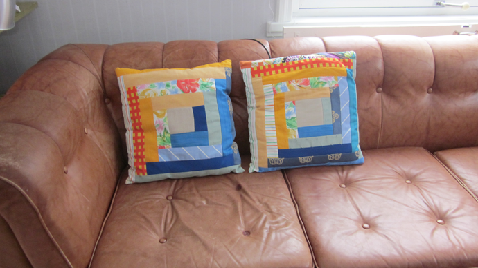 Dessa två kuddar har jag i soffan uppe i stugan, beviset på mitt första försök. Rött i mittrutan har jag lärt mig långt senare. Och mamma sa att man inte skulle ta för smala remsor för då skulle det bli för tråkigt innan man var klar. Där har jag kommit på att hon har helt fel.