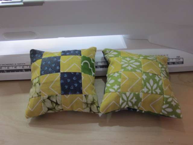 Efter denna duk gjorde jag återigen helt slut på alla mina scraps. De räckte till två minismå nåldynor. En till mig och en till väskmottagaren. Jag upptäckte att de inte har någon nåldyna till sina tre synålar och en stoppnål. Det måste de naturligtvis ha! :)